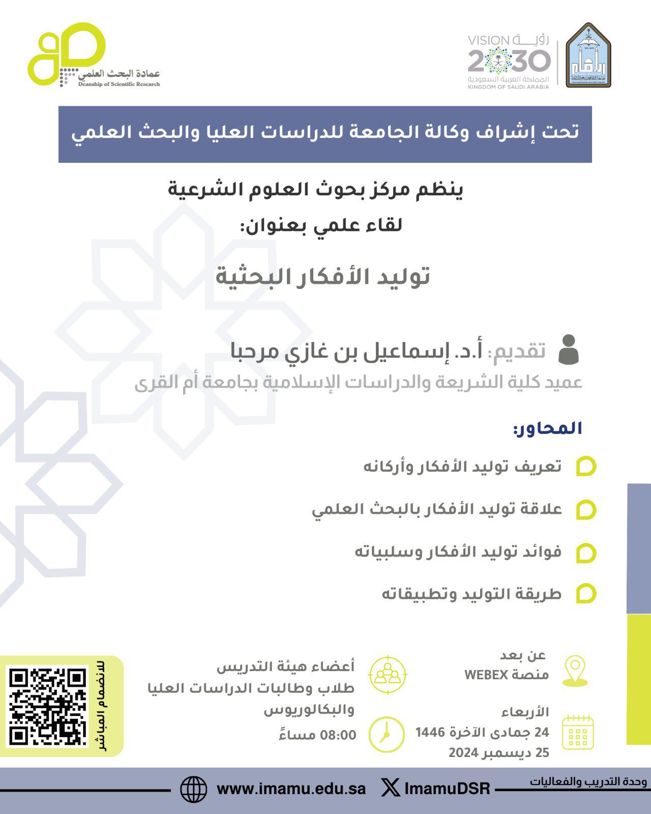 مركز بحوث العلوم الشرعية ينظم لقاءً علميًا بعنوان :(توليد الافكار البحثية)