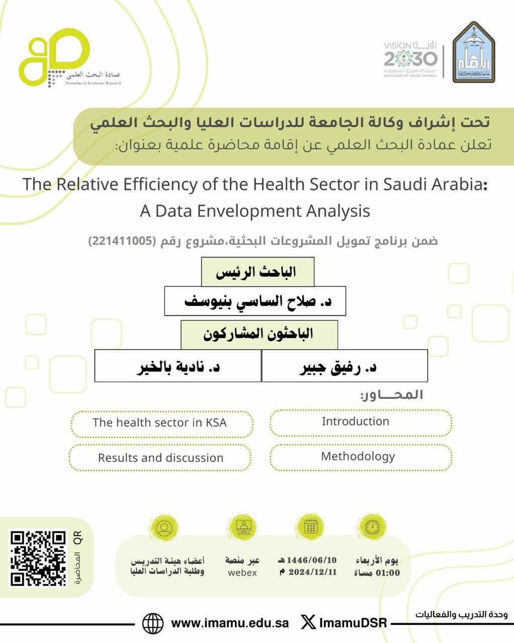 عمادة البحث العلمي تنظم محاضرة علمية بعنوان:(The Relative Efficiency of the Health Sector in Saudi Arabia: A Data Envelopment Analysis)