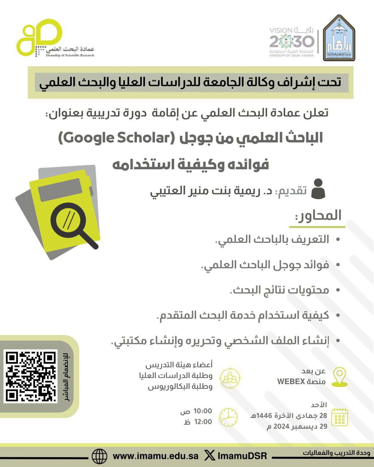 عمادة البحث العلمي تنظم دورة تدريبية بعنوان :(الباحث العلمي من جوجل "Google Scholar " فوائده وكيفية استخدامه)