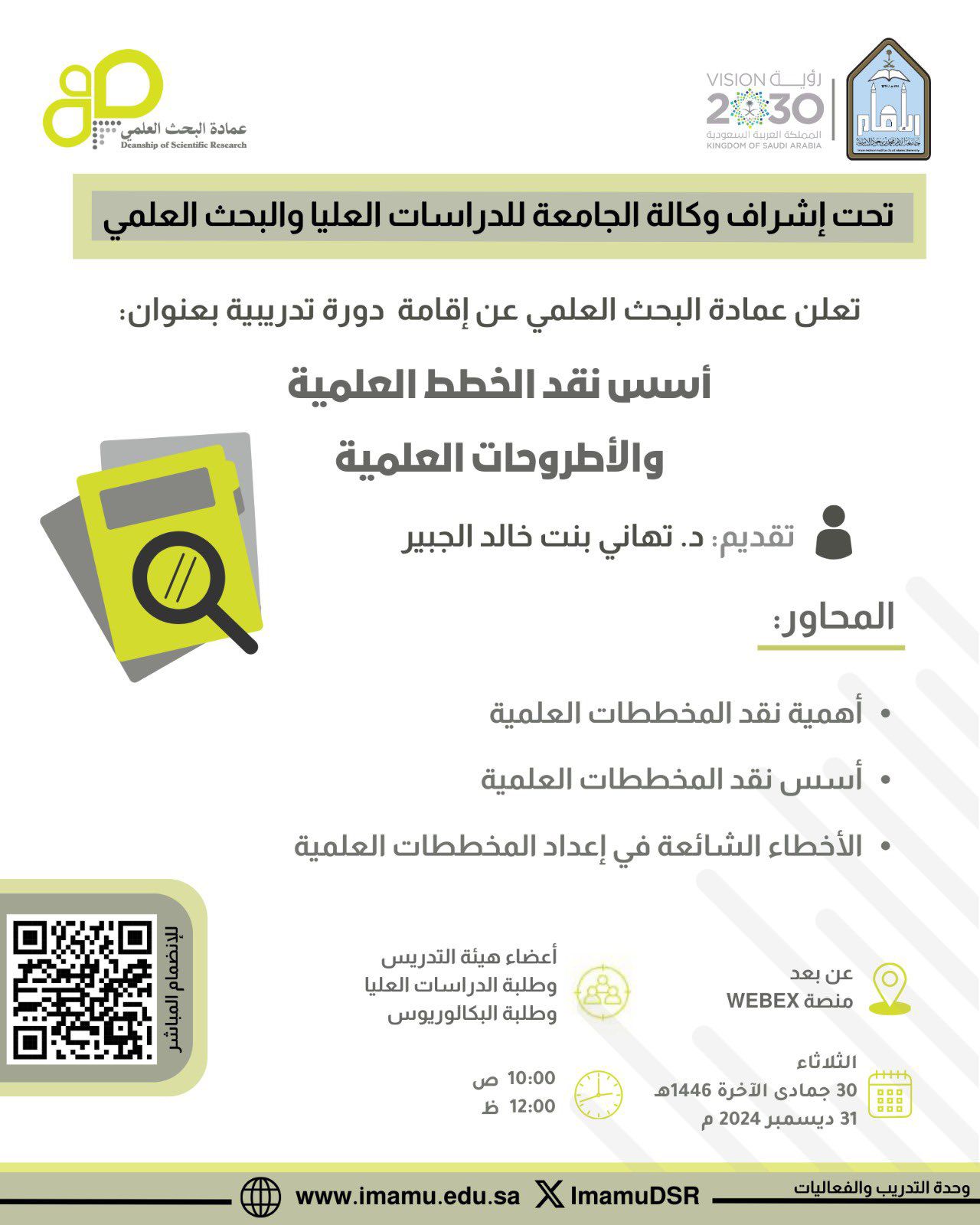 عمادة البحث العلمي تنظم دورة تدريبية بعنوان (أسس نقد الخطط العلمية والأطروحات العلمية)