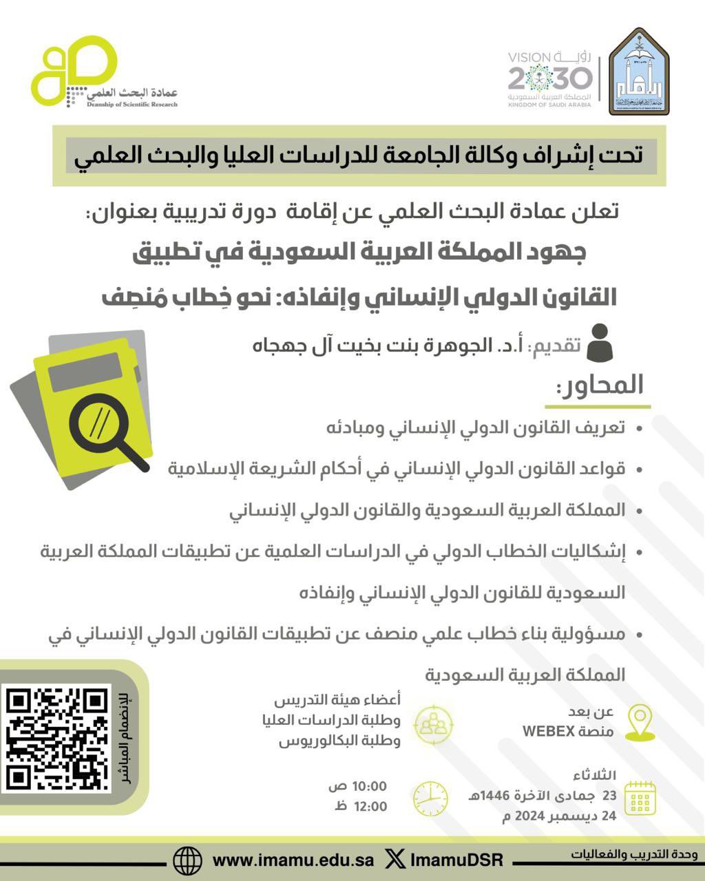 عمادة البحث العلمي تنظم دورة تدريبية بعنوان: (جهود المملكة العربية السعودية في تطبيق القانون الدولي الإنساني وإنفاذه: نحو خِطاب مُنصِف)