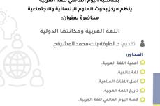تزامناً مع اليوم العالمي للغة العربية، نظم مركز بحوث العلوم الإنسانية والاجتماعية تحت إشراف وكالة الجامعة للدراسات العليا والبحث العلمي محاضرة علمية بعنوان: (اللغة العربية ومكانتها الدولية) والتي قدمتها د. لطيفة بنت محمد المشيقح، حيث تناولت خمسة محاور رئيسية، شملت: أهمية اللغة العربية، لغة عالمية، أصل اللغات السامية، تاريخ اللغة العربية، وأخيراً قصة اليوم العالمي للغة العربية.