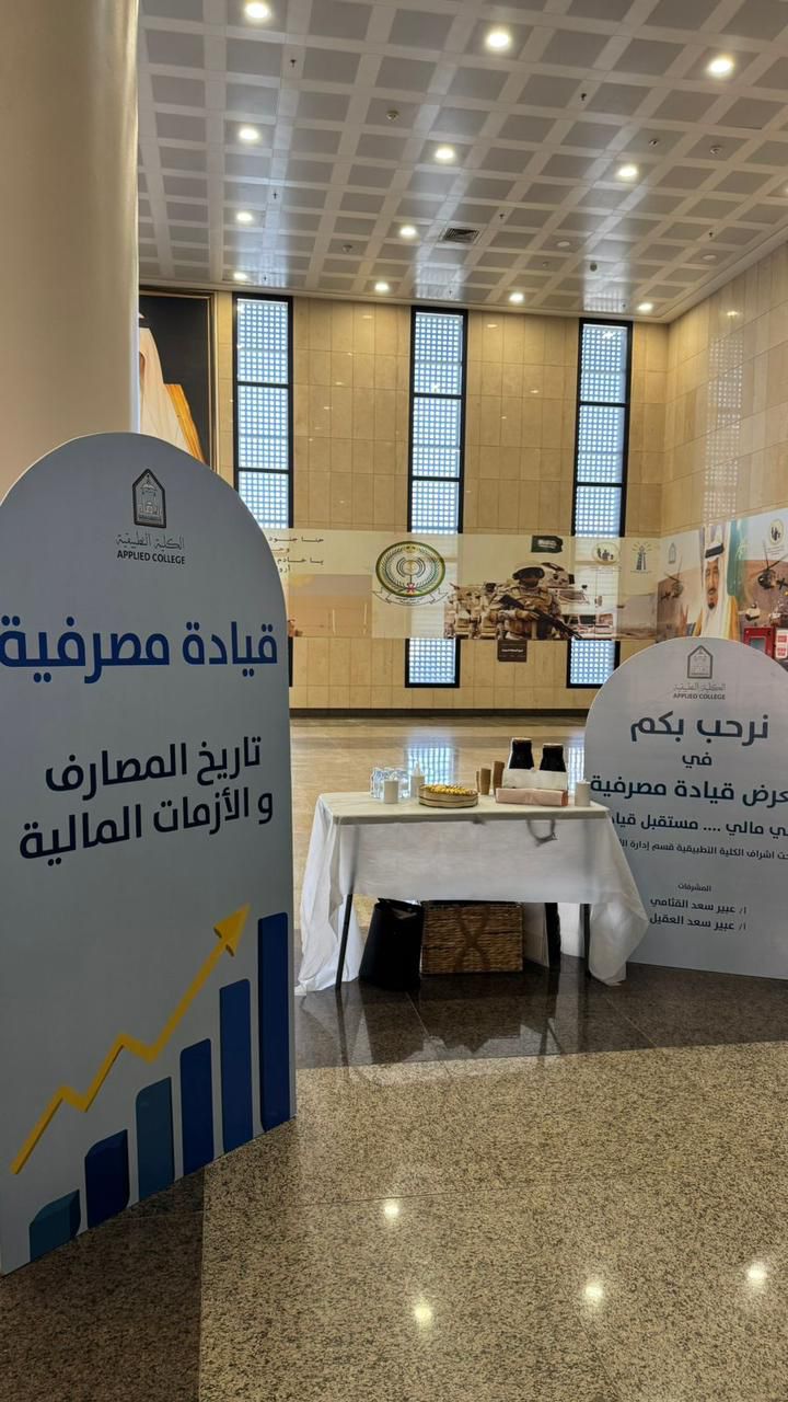 نظمت الكلية التطبيقية فعالية توعوية (معرض قيادة مصرفية )نفذتها طالبات مقرر مبادئ الاعمال المصرفية في الكلية التطبيقية، وتهدف إلى تعزيز الوعي المالي لدى الطالبات والزائرات، وتسليط الضوء على المفاهيم المصرفية الحديثة من خلال أركان توعوية تفاعلية.