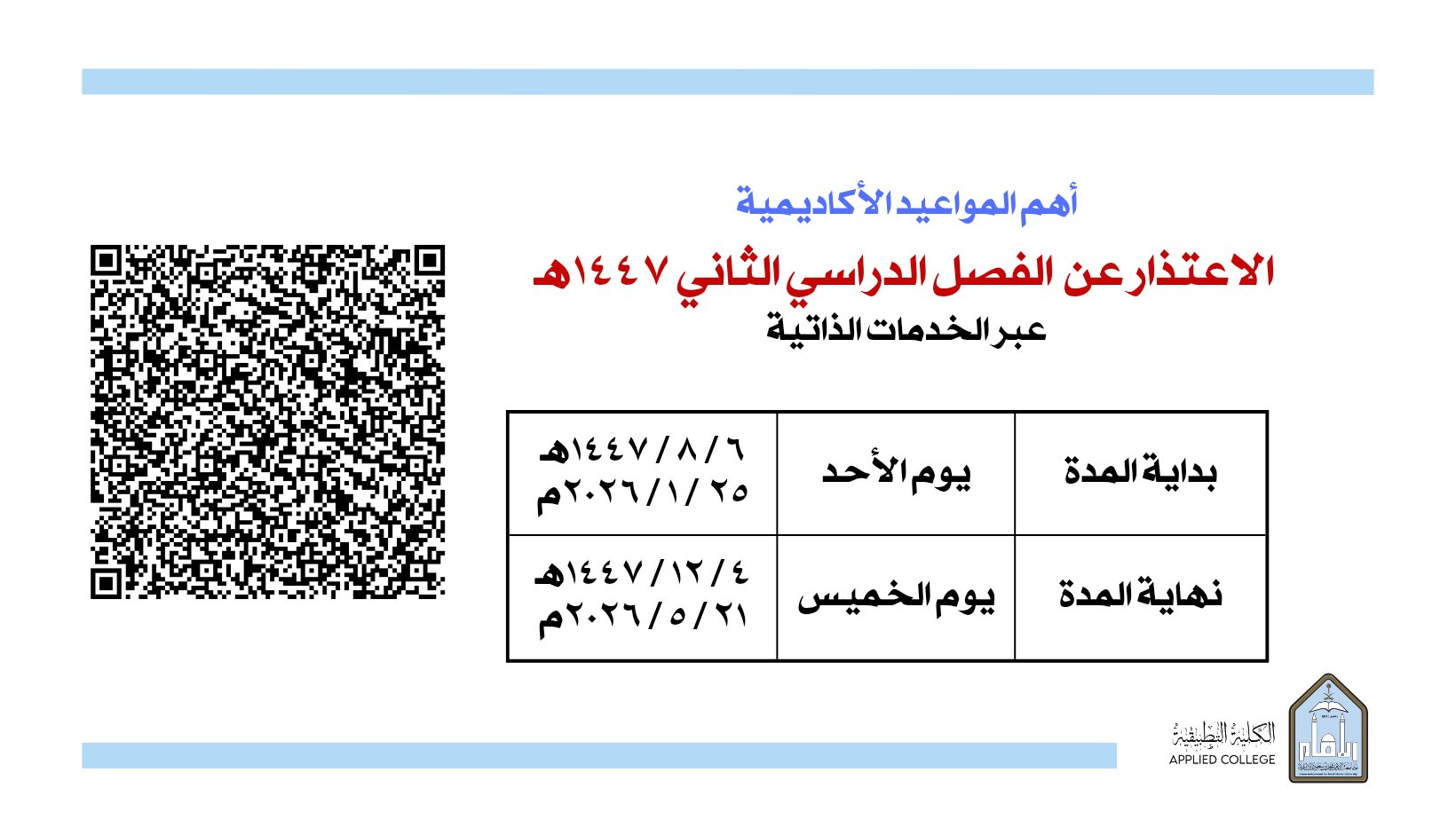 تعلن الكلية التطبيقية عن موعد (الاعتذار) عن الفصل الدراسي الثاني للعام الجامعي ١٤٤٧هـ، وذلك عن طريق الخدمات الذاتية: http://iu.sa/Ws8a3