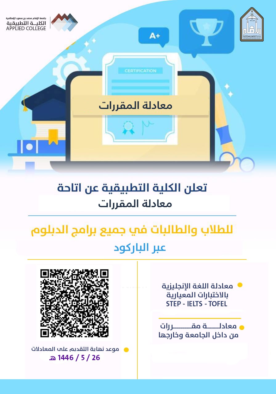 تعلن الكلية التطبيقية عن إتاحة معادلة المقررات للطلاب والطالبات في جميع برامج الدبلوم للفصل الدراسي الثاني من العام الجامعي ١٤٤٦هـ من خلال الرابط التالي: