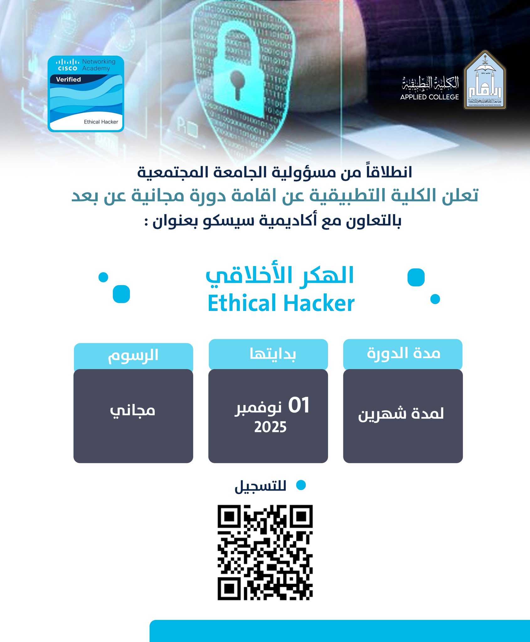 انطلاقاً من مسؤولية الجامعة المجتمعية تعلن الكلية التطبيقية عن إقامة دورة مجانية عن بعد بالتعاون مع أكاديمية سيسكو بعنوان : الهكر الأخلاقي