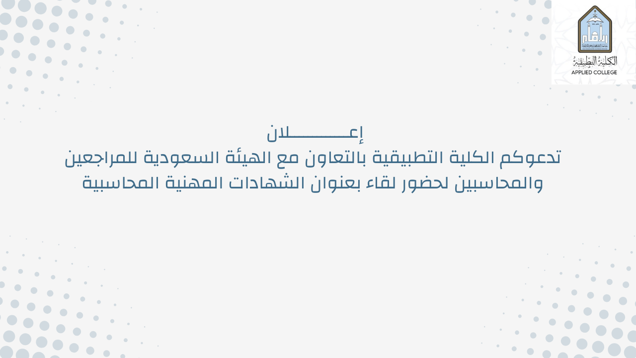 تدعوكم الكلية التطبيقية لحضور لقاء بعنوان( الشهادات المهنية المحاسبية وأهميتها لخريجي دبلوم المحاسبة)