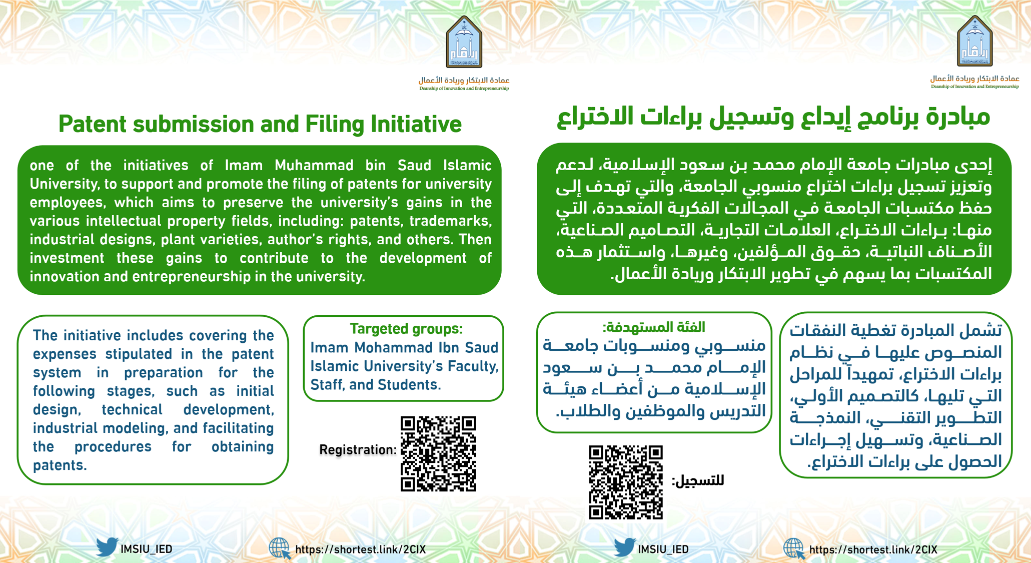 إحدى مبادرات جامعة الإمام محمد بن سعود الإسلامية، لدعم وتعزيز تسجيل براءات اختراع منسوبي الجامعة، والتي تهدف إلى حفظ مكتسبات الجامعة في المجالات الفكرية المتعددة، التي منها: براءات الاختراع، العلامات التجارية، التصاميم الصناعية، الأصناف النباتية، حقوق المؤلفين، وغيرها، واستثمار هذه المكتسبات بما يسهم في تطوير الابتكار وريادة الأعمال