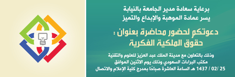 تحت رعاية سعادة مدير الجامعة بالنيابة ، نظمت عمادة الموهبة والإبداع والتميز وبالتعاون مع مكتب البراءات السعودي بمدينة الملك عبد العزيز للعلوم والتقنية محاضرة تعريفية عن حقوق الملكية الفكرية حضرها عميد الموهبة والإبداع والتميز الدكتور عبدالله بن ثاني وسعادة وكيل العمادة وموظفي العمادة وعدد من أعضاء هيئة التدريس وطلاب الجامعة وذلك يوم الاثنين 25/2/1437هـ على مدرج كلية الإعلام والاتصال وقدم المحاضرة الأستاذ حسن المزنعي أخصائي براءات الاختراع بمدينة الملك عبد العزيز للعلوم والتقنية .
