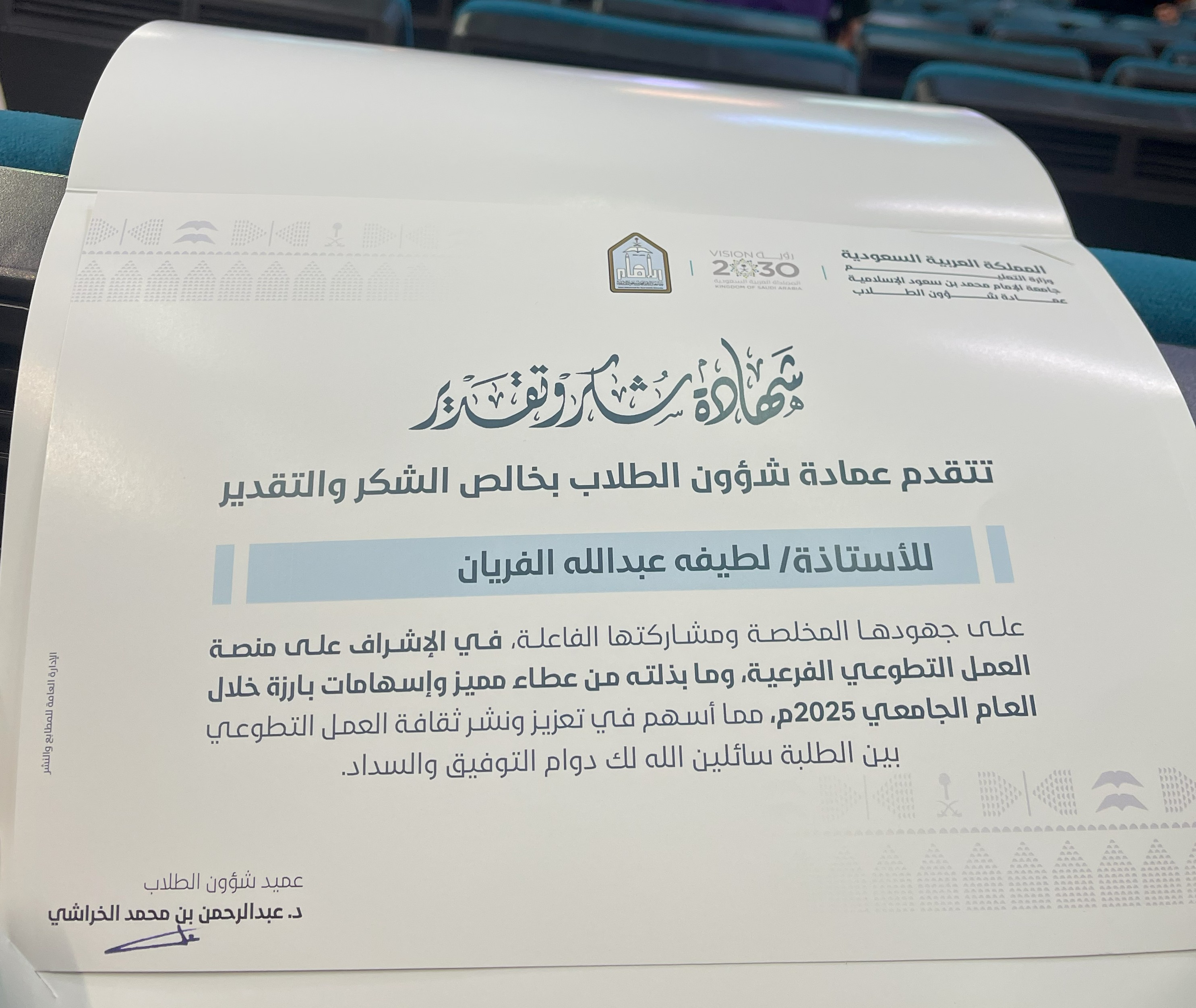 واشتمل الحفل على تكريم ممثلي العمل التطوعي في الجهات المختلفة بالجامعة، تقديرًا لجهودهم في تفعيل المبادرات التطوعية وتعزيز المشاركة المجتمعية، وكان من بينهم ممثل مركز الابتكار وريادة الأعمال، الأستاذة لطيفة الفريان، تقديرًا لإسهاماتها في دعم وتنفيذ المبادرات التطوعية، وتعزيز أثرها المستدام.