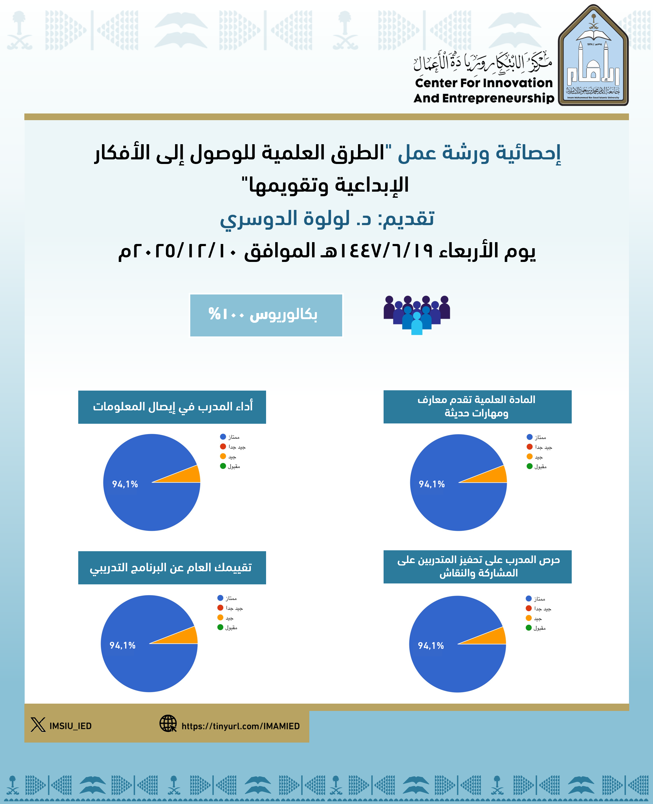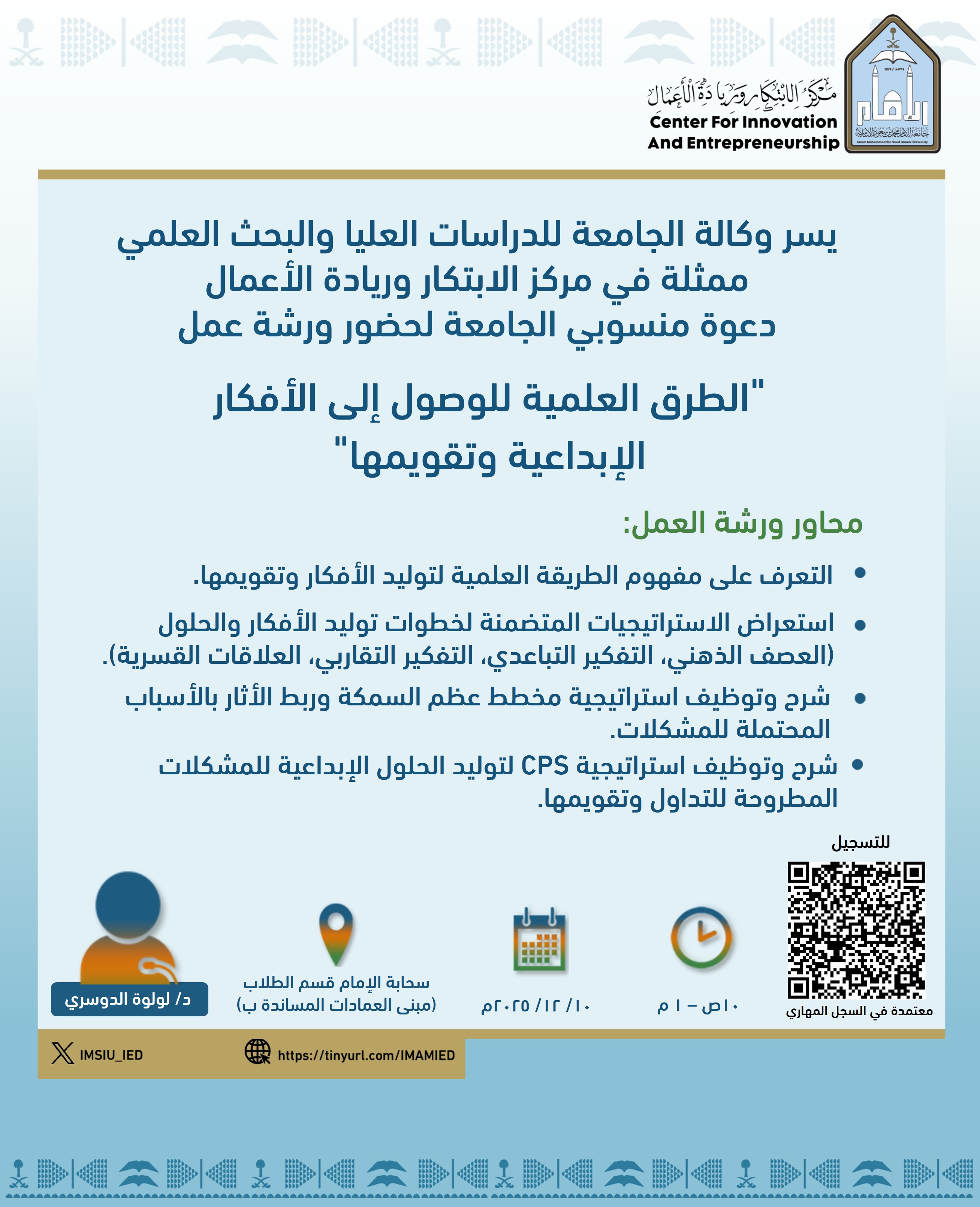 نفّذ مركز الابتكار وريادة الأعمال يوم الأربعاء الموافق 10 ديسمبر 2025م، في مقر حاضنة الأعمال "سحابة الإمام"، ورشة عمل بعنوان "الطرق العلمية للوصول إلى الأفكار الإبداعية وتقويمها"، وذلك ضمن جهود المركز في تنمية مهارات منسوبي الجامعة وتعزيز ثقافة الابتكار والتفكير الإبداعي.