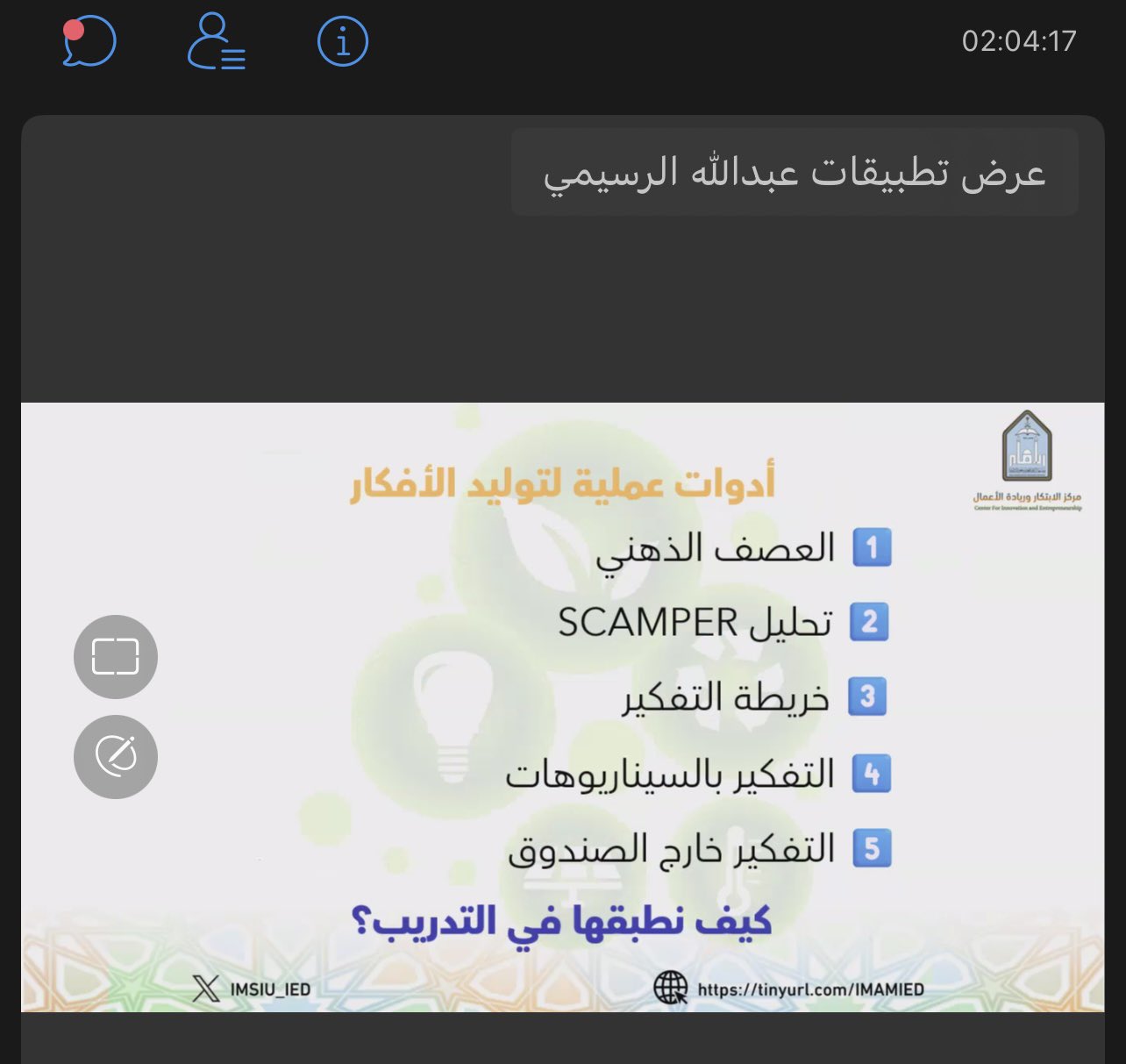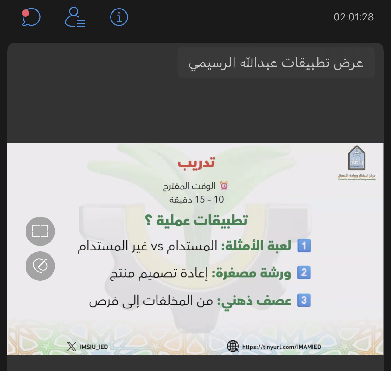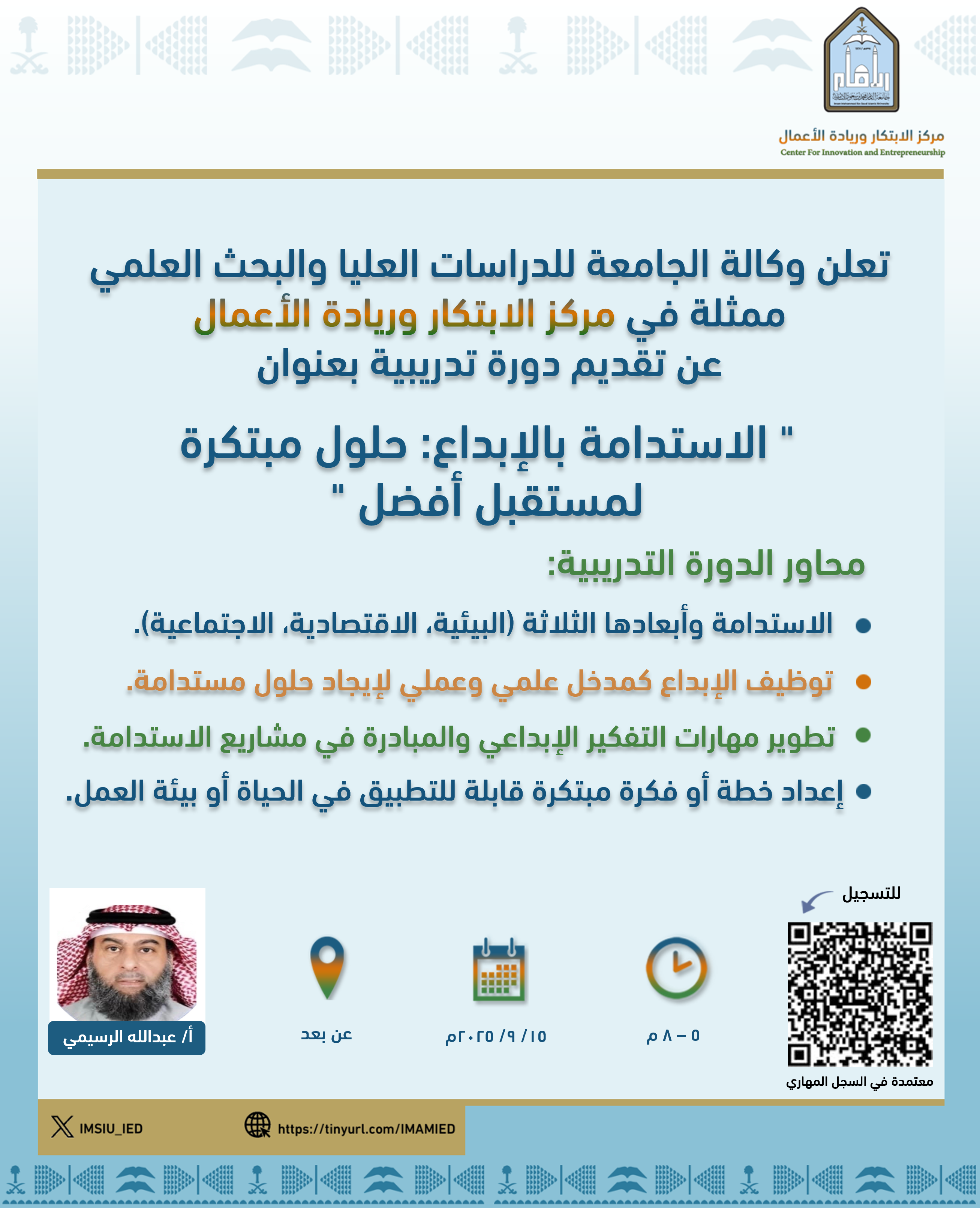 ​​أقامت وكالة الجامعة للدراسات العليا والبحث العلمي ممثلة في مركز الابتكار وريادة الأعمال، دورة تدريبية عن بُعد بعنوان "الاستدامة بالإبداع: حلول مبتكرة لمستقبل أفضل"، وذلك يوم الاثنين 23 ربيع الأول 1447هـ الموافق 15 سبتمبر 2025م، وقدمها ​د. عبدالله الرسيمي، ناقش خلالها ممارسات عملية وأفكاراً ريادية تسهم في تعزيز الاستدامة وتحويل التحديات إلى فرص ابتكار تدعم مستقبل الوطن، وسط تفاعل ثري من المشاركين.​