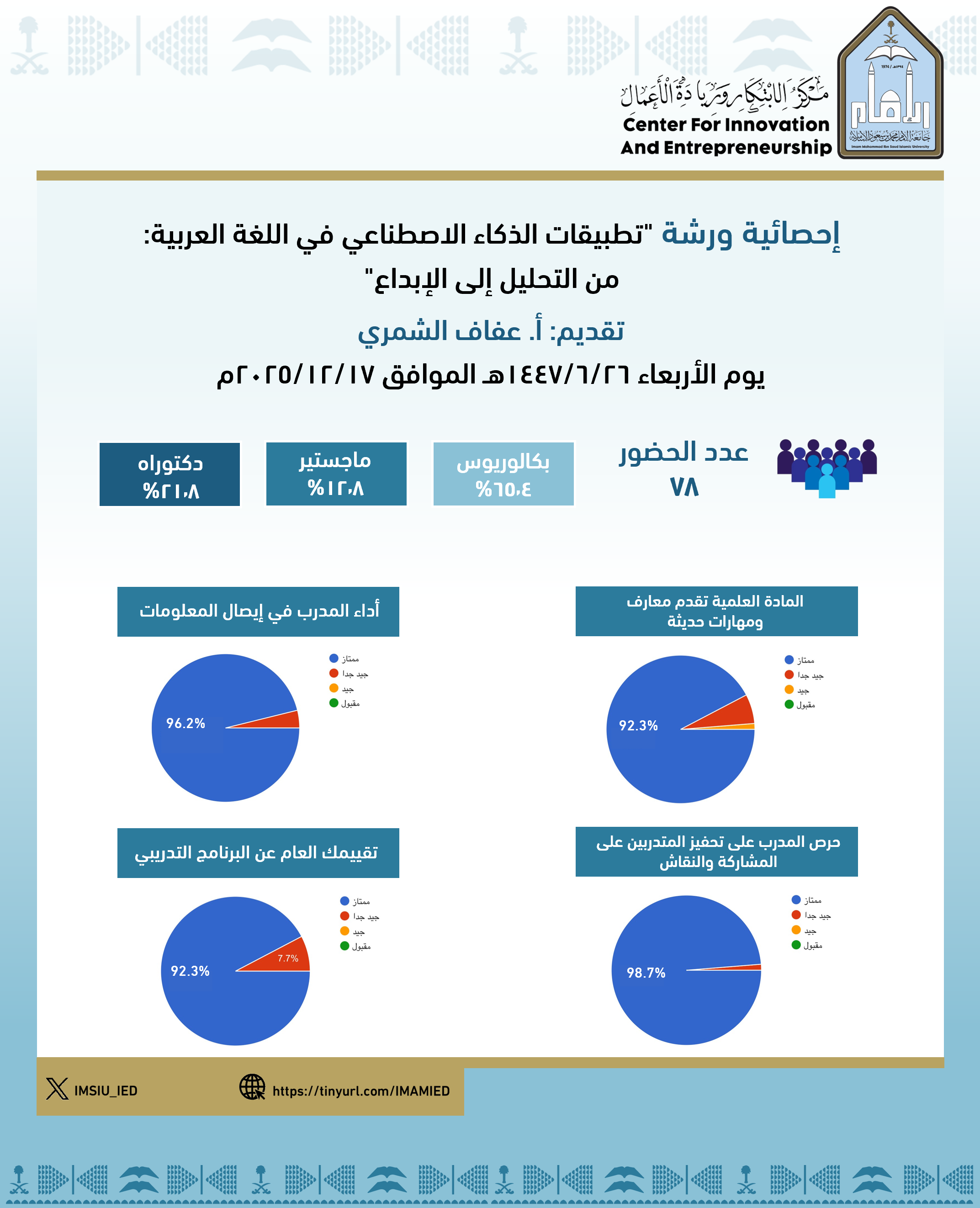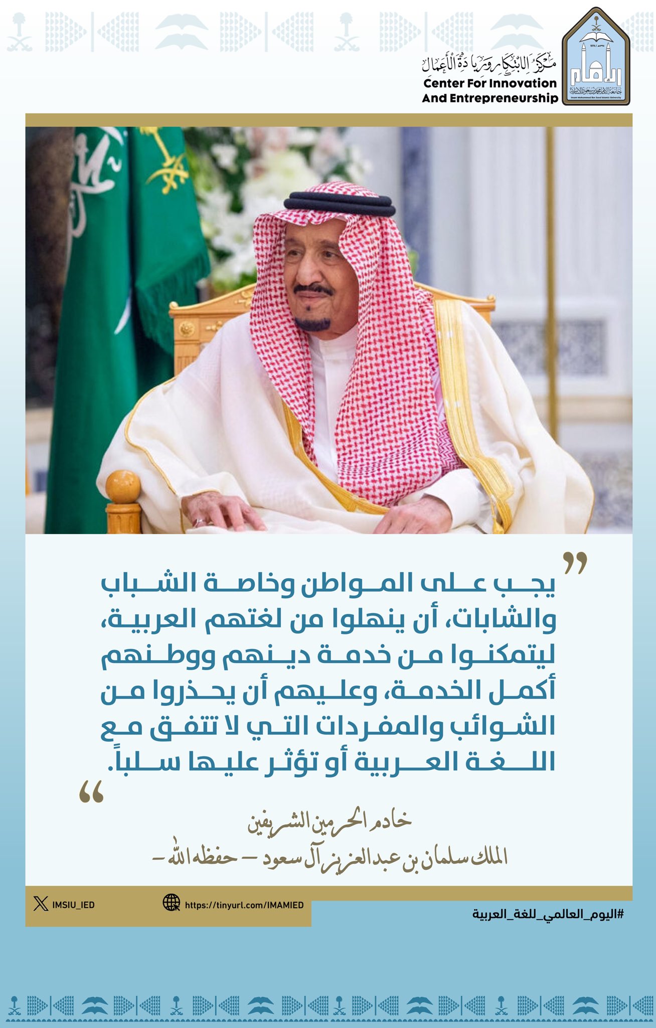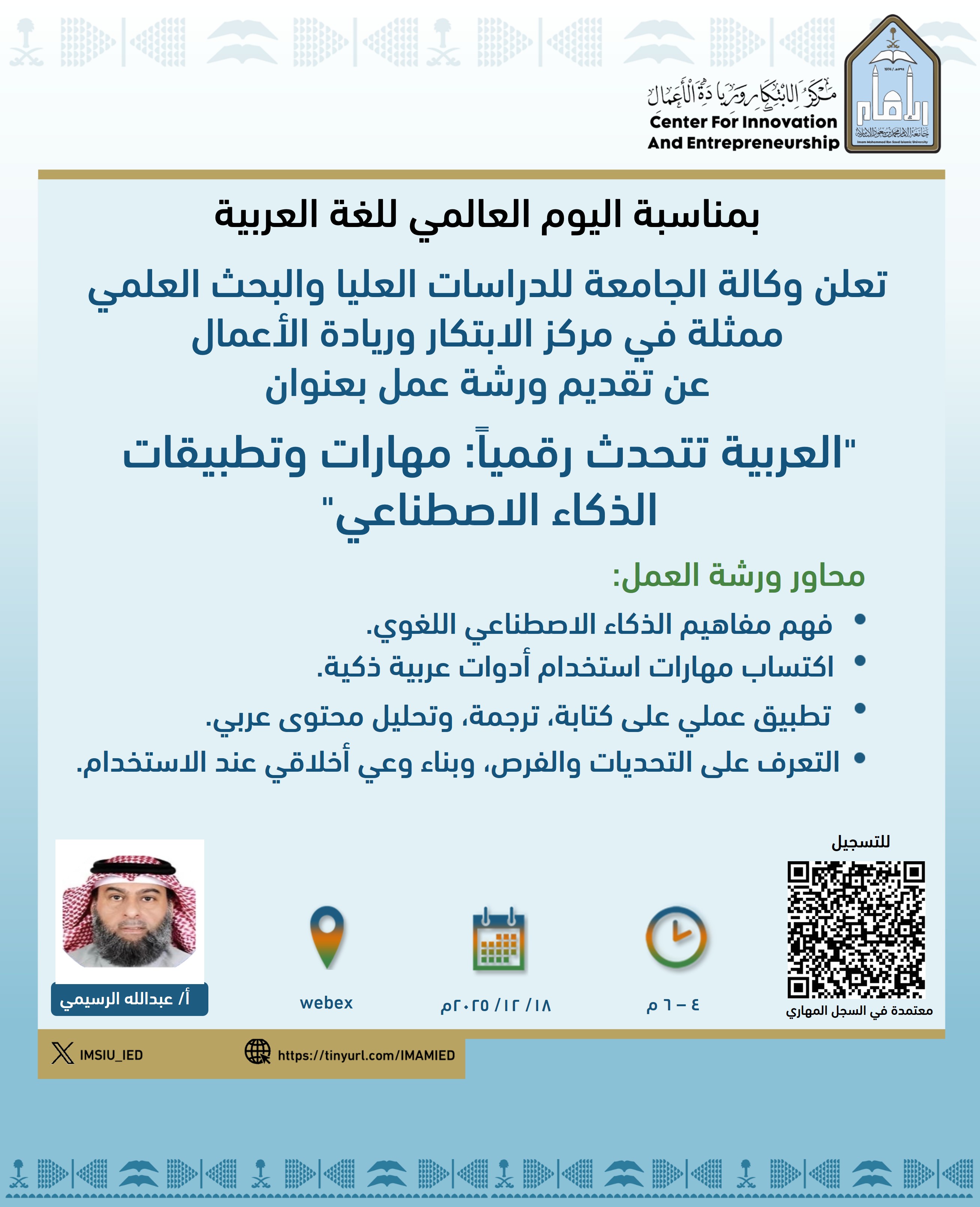 بمناسبة اليوم العالمي للغة العربية، نظّم مركز الابتكار وريادة الأعمال عدداً من الفعاليات المتنوعة، شملت: نشر محتوى توعوي عبر المنصات الرقمية، وتقديم ورشتين تدريبيتين افتراضيتين عبر منصة (Webex)، هدفتا إلى إبراز دور التقنيات الحديثة والذكاء الاصطناعي في خدمة اللغة العربية وتعزيز حضورها في البيئة الرقمية.