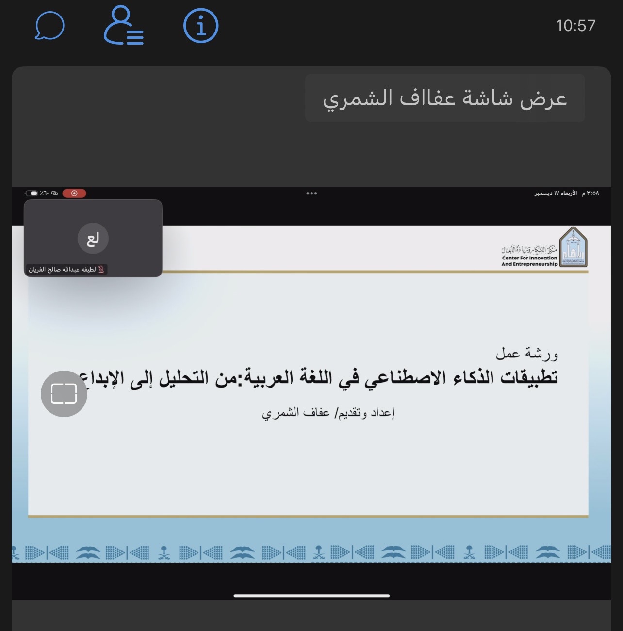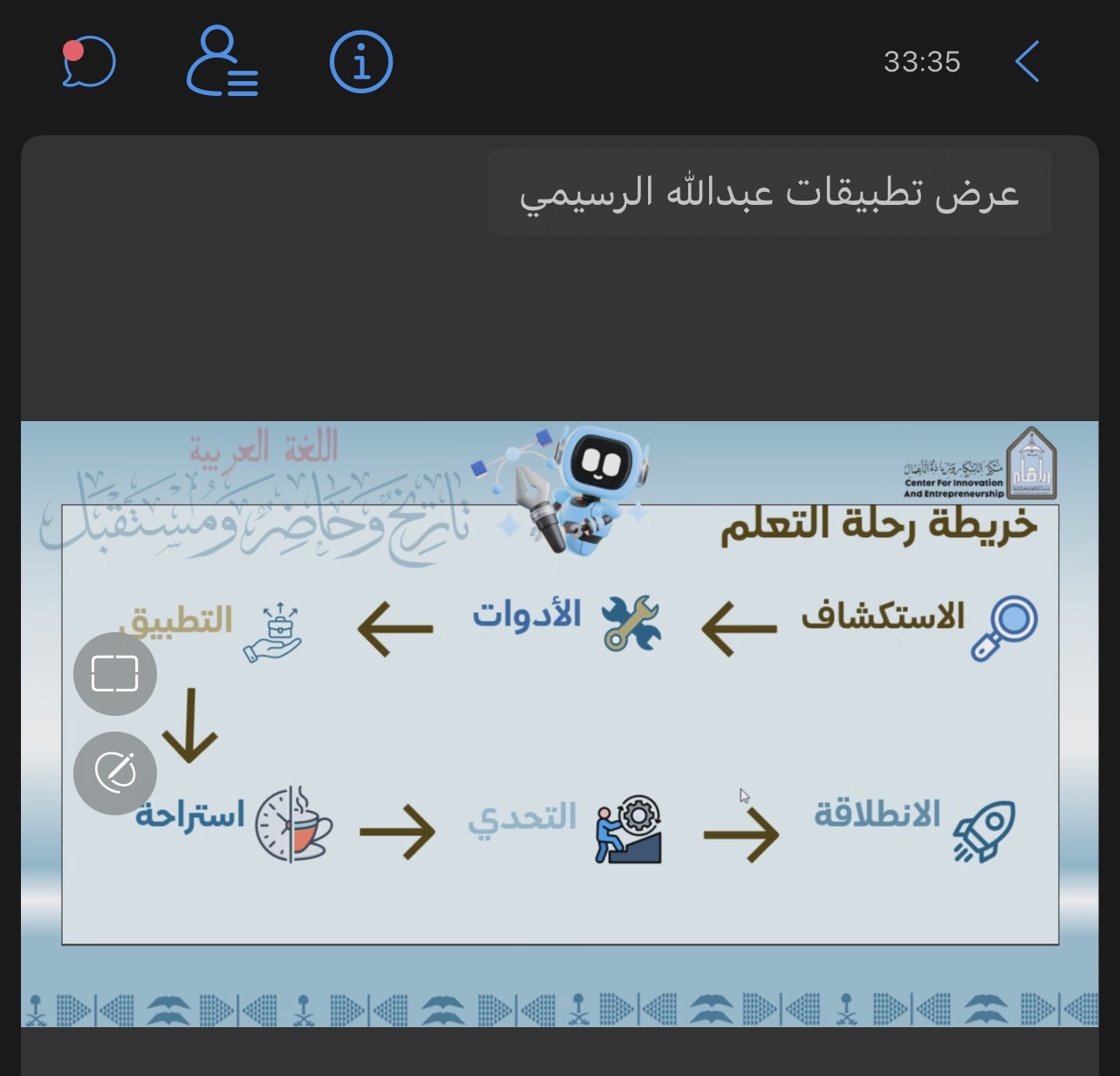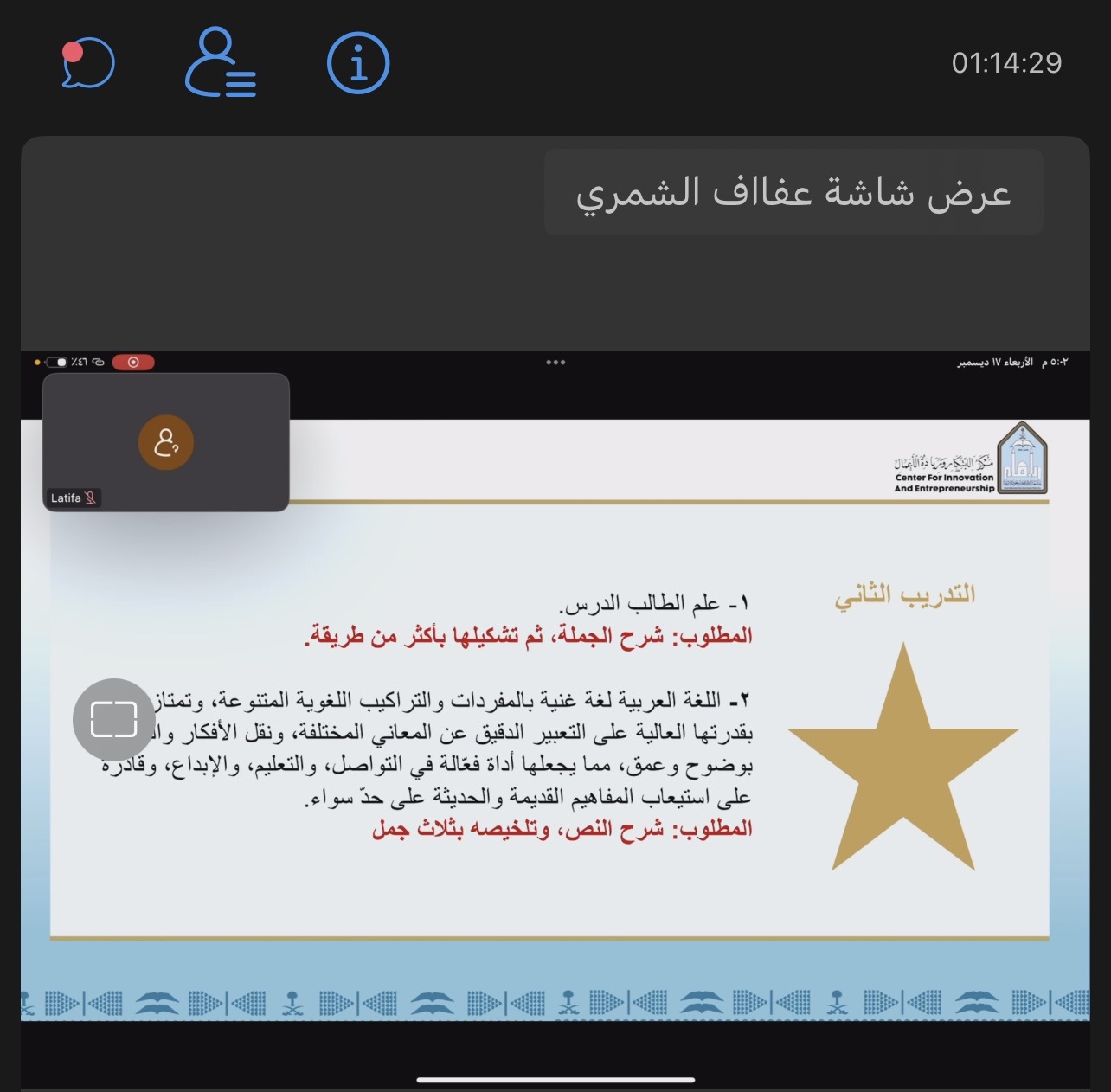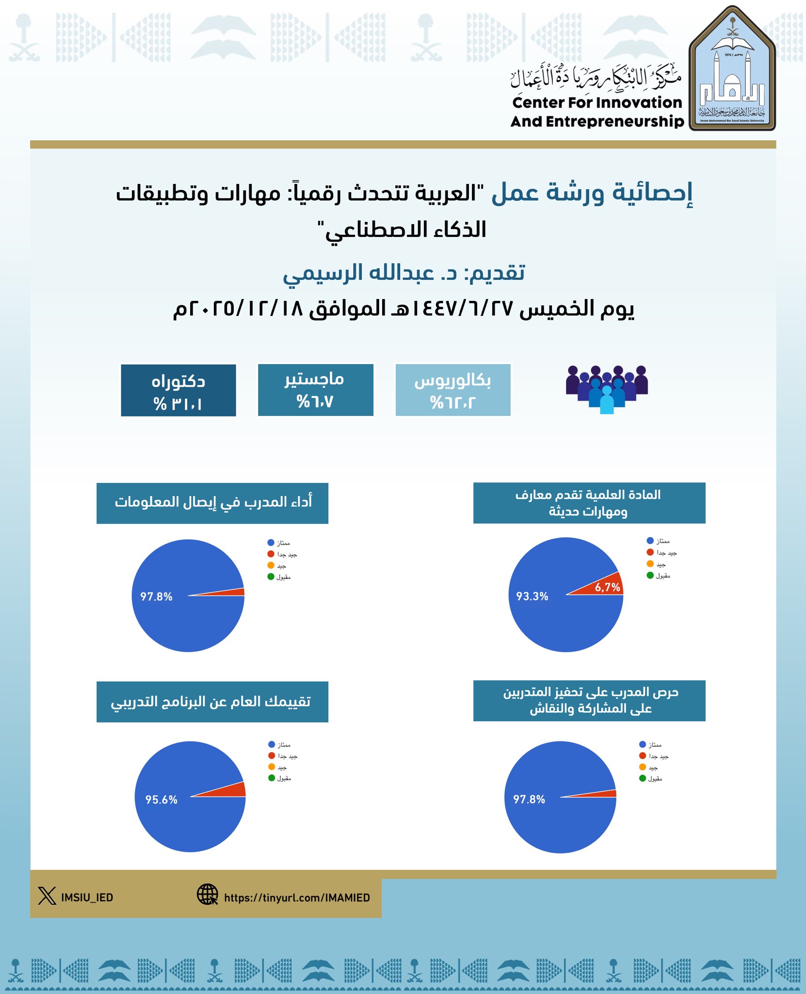 بمناسبة اليوم العالمي للغة العربية، نظّم مركز الابتكار وريادة الأعمال عدداً من الفعاليات المتنوعة، شملت: نشر محتوى توعوي عبر المنصات الرقمية، وتقديم ورشتين تدريبيتين افتراضيتين عبر منصة (Webex)، هدفتا إلى إبراز دور التقنيات الحديثة والذكاء الاصطناعي في خدمة اللغة العربية وتعزيز حضورها في البيئة الرقمية.