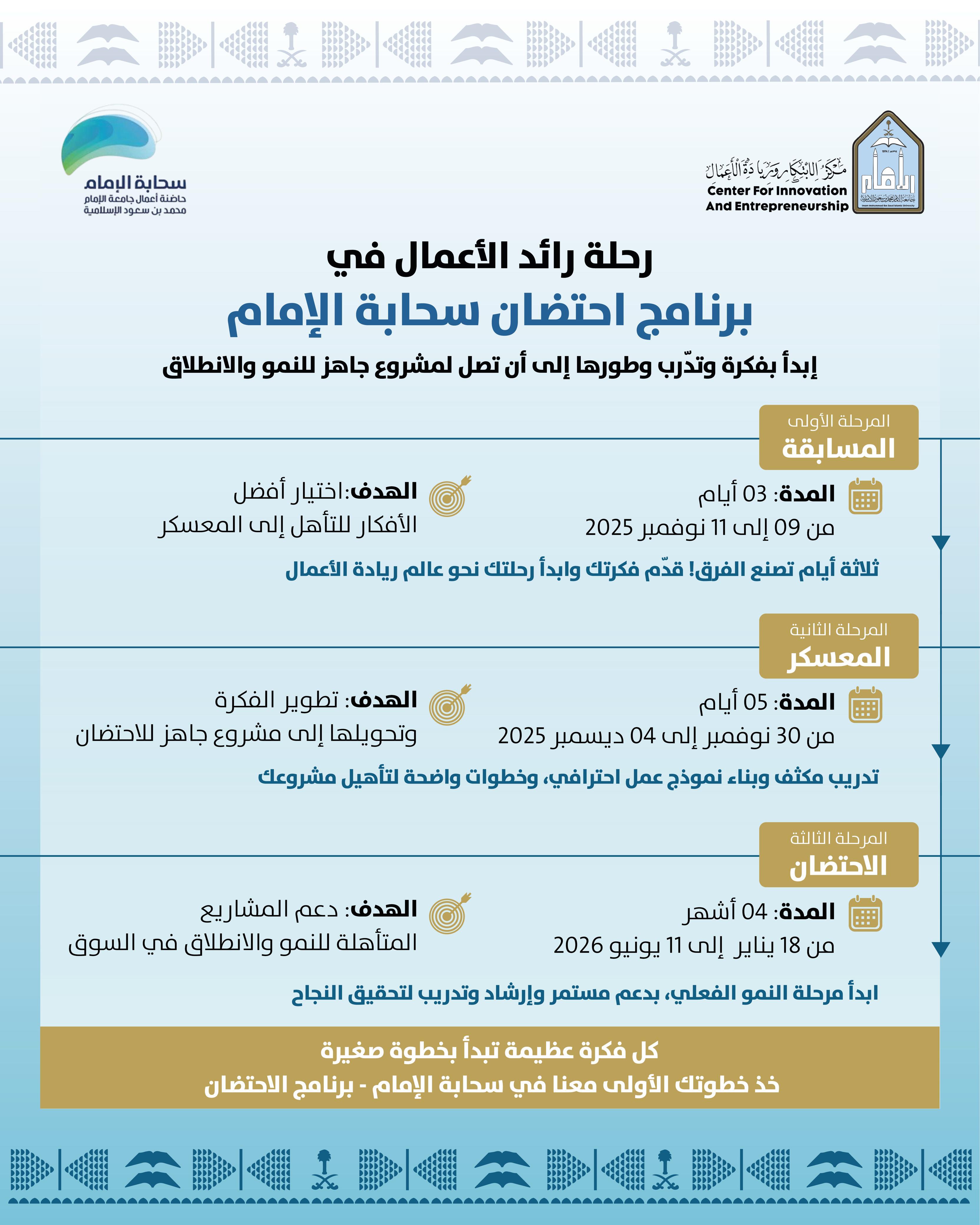 ويُنفّذ برنامج الاحتضان عبر ثلاث مراحل رئيسة تشكل رحلة متكاملة لرائد الأعمال داخل حاضنة "سحابة الإمام":