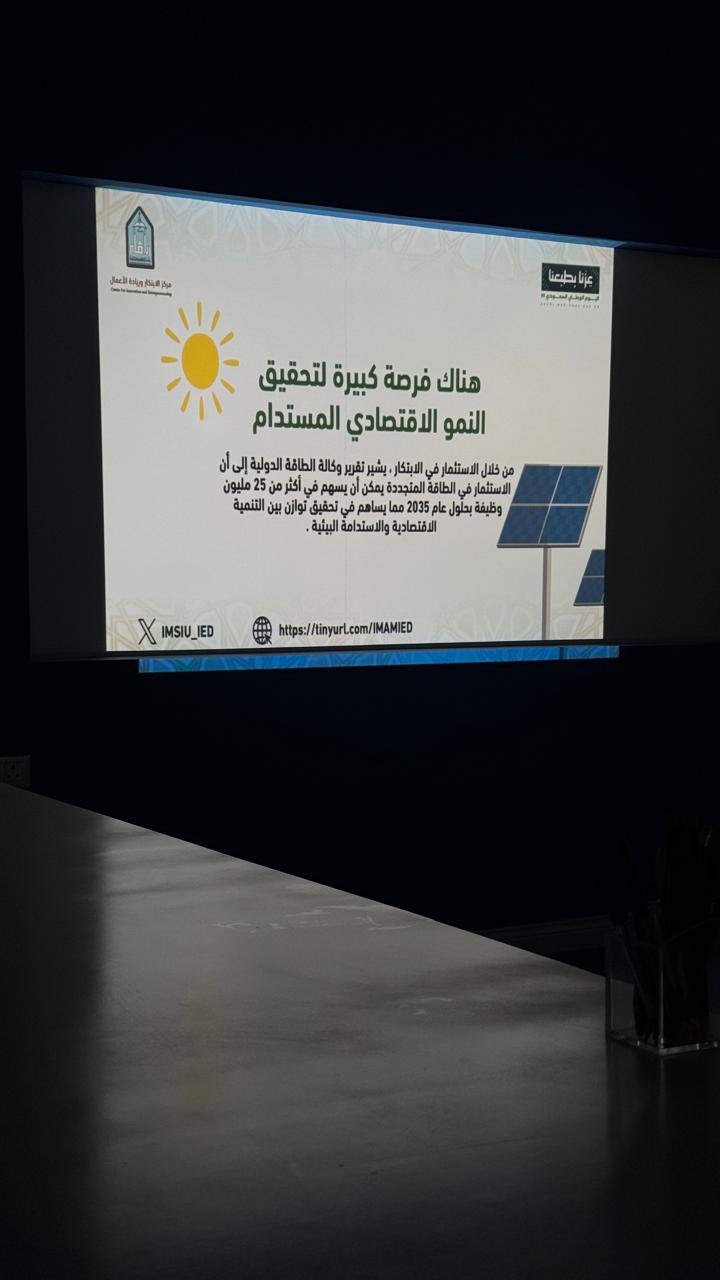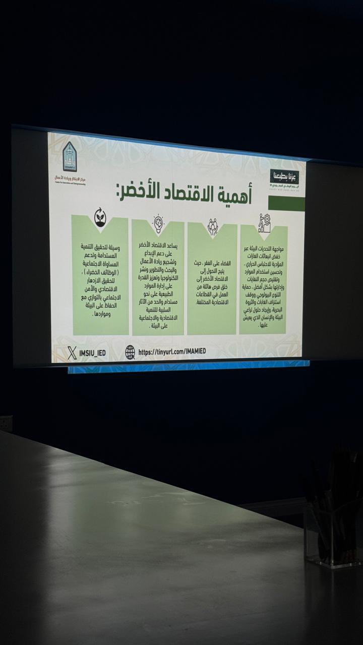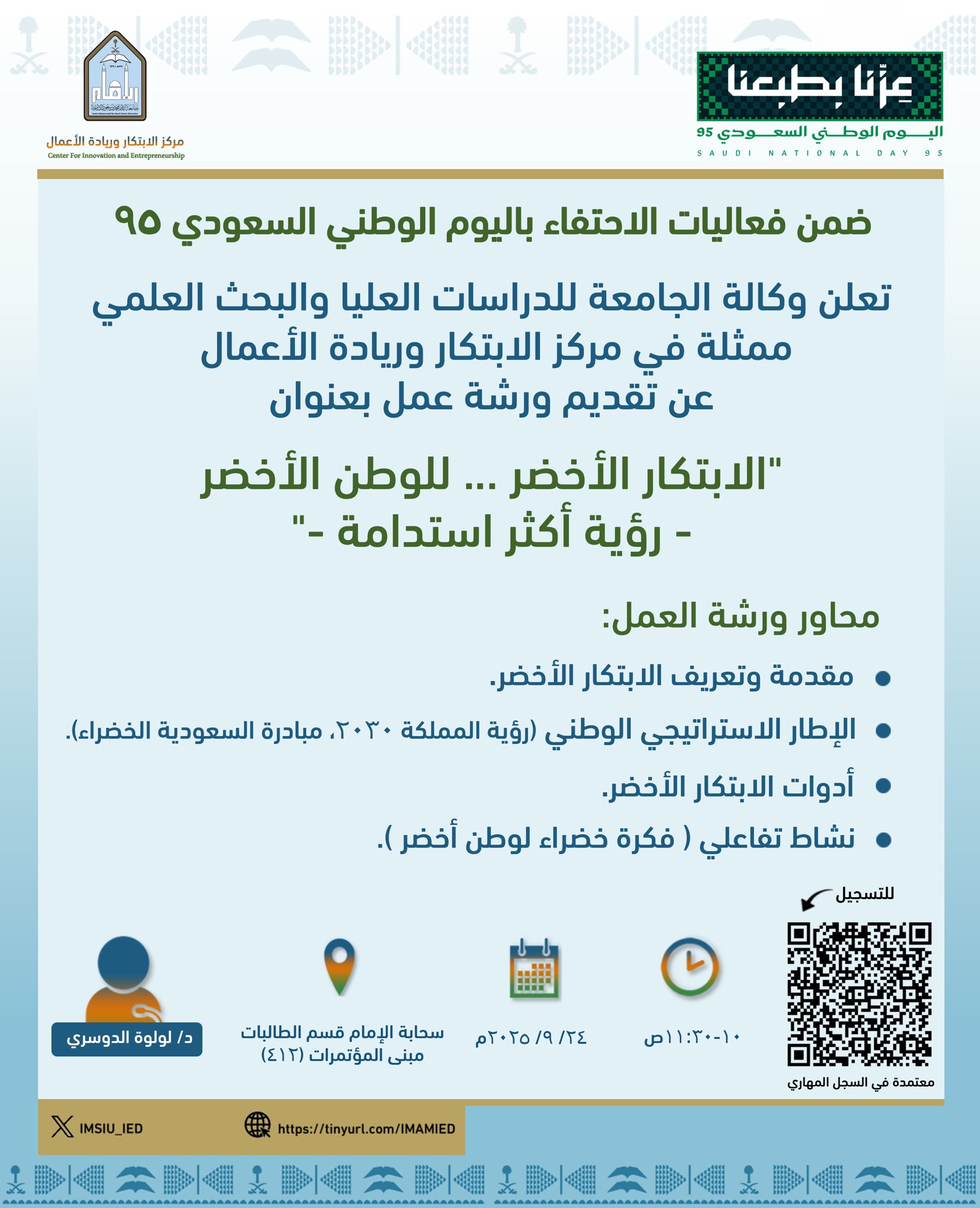 ضمن فعاليات احتفاء جامعة الإمام محمد بن سعود الإسلامية باليوم الوطني السعودي 95، نفّذ مركز الابتكار وريادة الأعمال يوم الأربعاء 23 سبتمبر 2025 في حاضنة الأعمال (سحابة الإمام) ورشة عمل بعنوان "الابتكار الأخضر..للوطن الأخضر -رؤية أكثر استدامة-"، قدمتها د. لولوة الدوسري، ناقشت خلالها دور الابتكار المستدام في صناعة مستقبل أخضر للوطن الغالي، وسط تفاعل مميز من الطالبات.