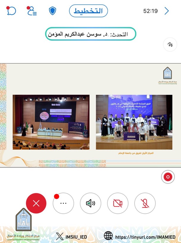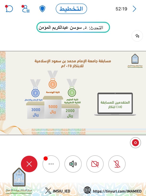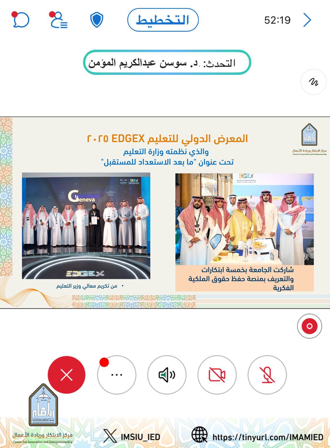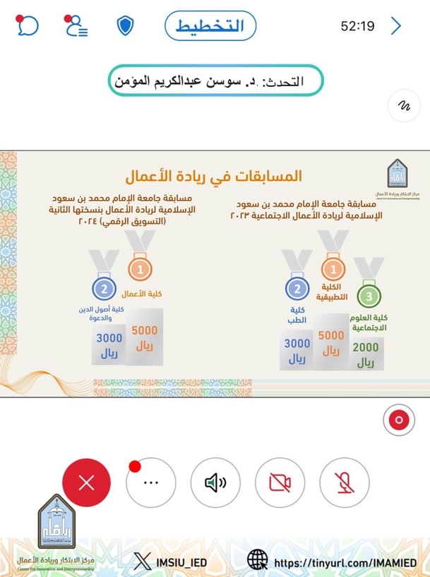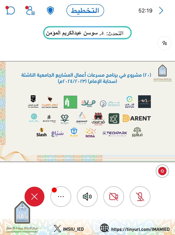 بحضور سعادة رئيس مركز الابتكار وريادة الأعمال د. سوسن المؤمن وفريق عمل حاضنة أعمال سحابة الإمام، أقام المركز لقاءات افتراضية (عن بعد) مع عدد من الكليات والمعاهد العلمية، هدف اللقاء التعريف بانطلاق برامج وأنشطة حاضنة أعمال الجامعة (سحابة الإمام)، وبحث سبل التعاون المشترك.