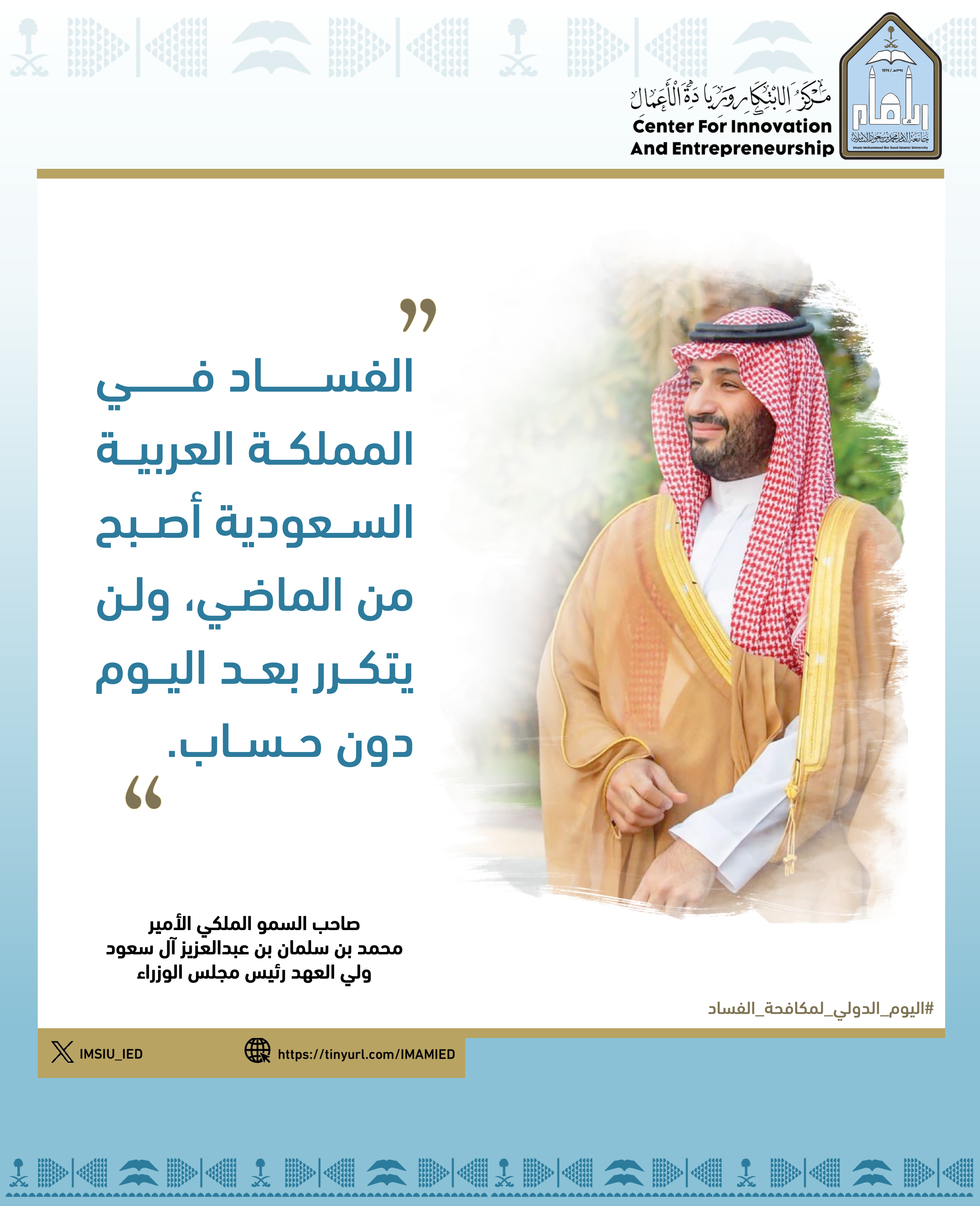 وشملت الفعالية تقديم رسائل إرشادية حول أهمية مكافحة الفساد ودورها في حماية المكتسبات الوطنية ، وذلك بمقر حاضنة الأعمال "سحابة الإمام" في شطر الطلاب وشطر الطالبات، وعبر حساب المركز على منصة X.