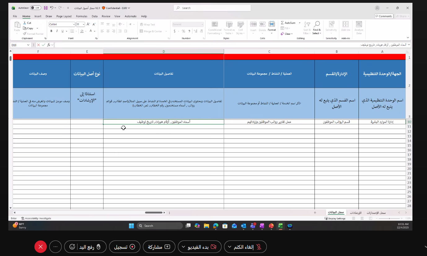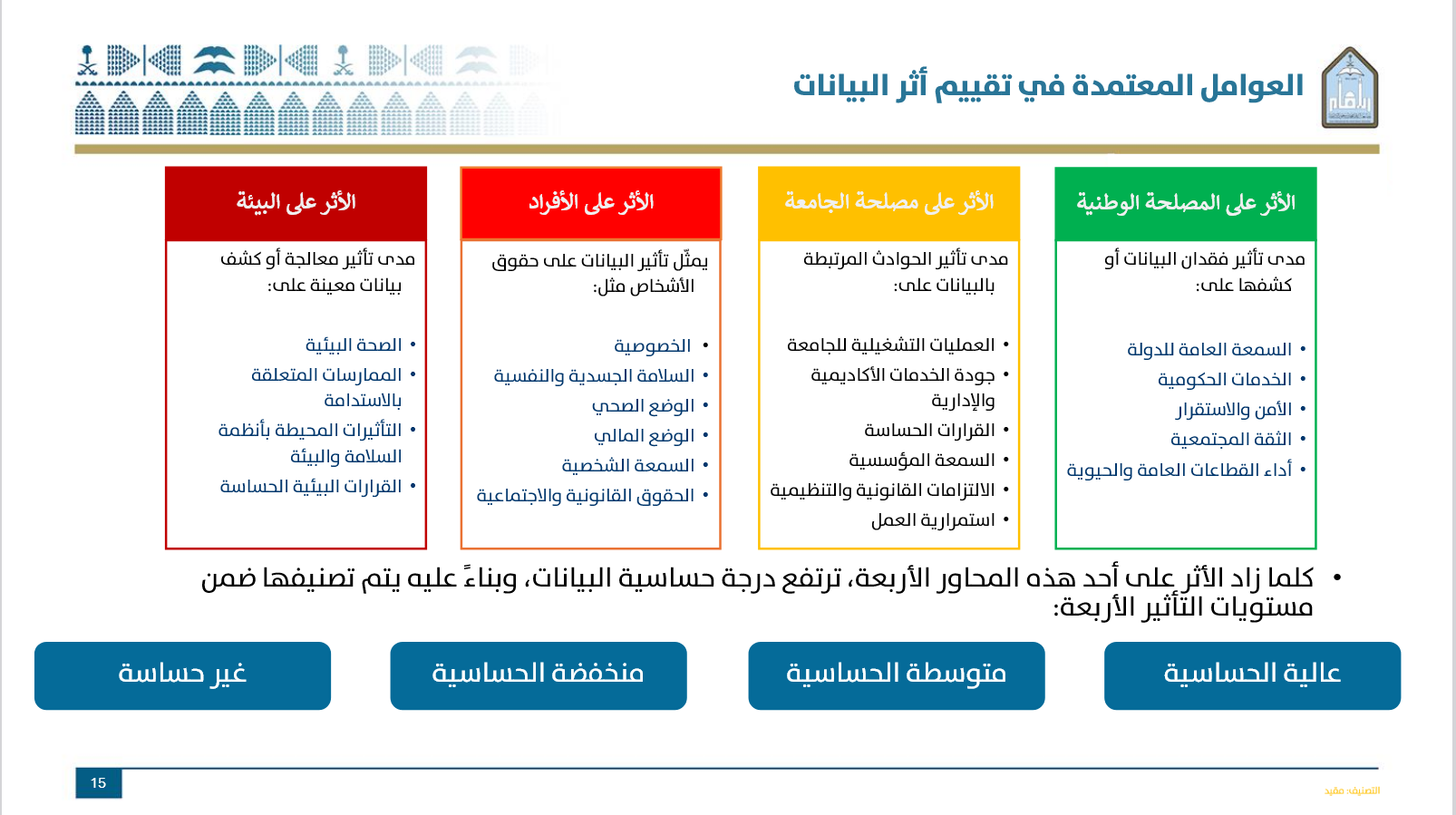 وتناولت الورشة شرحًا لمراحل تصنيف البيانات، إضافة إلى توضيح خطوات تعبئة النماذج المخصصة لهذا الغرض، وبيان مسؤوليات ممثلي تصنيف البيانات في جميع الإدارات. كما تم خلال الورشة عرض أمثلة عملية.
