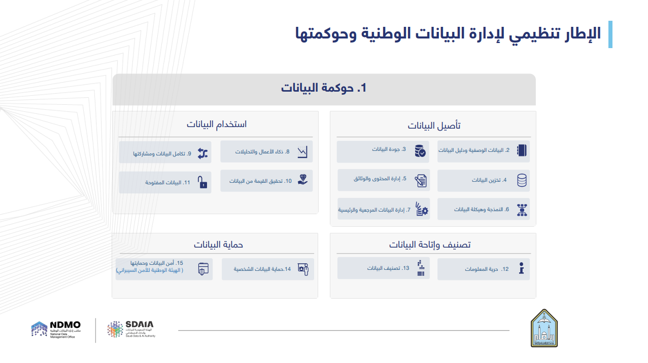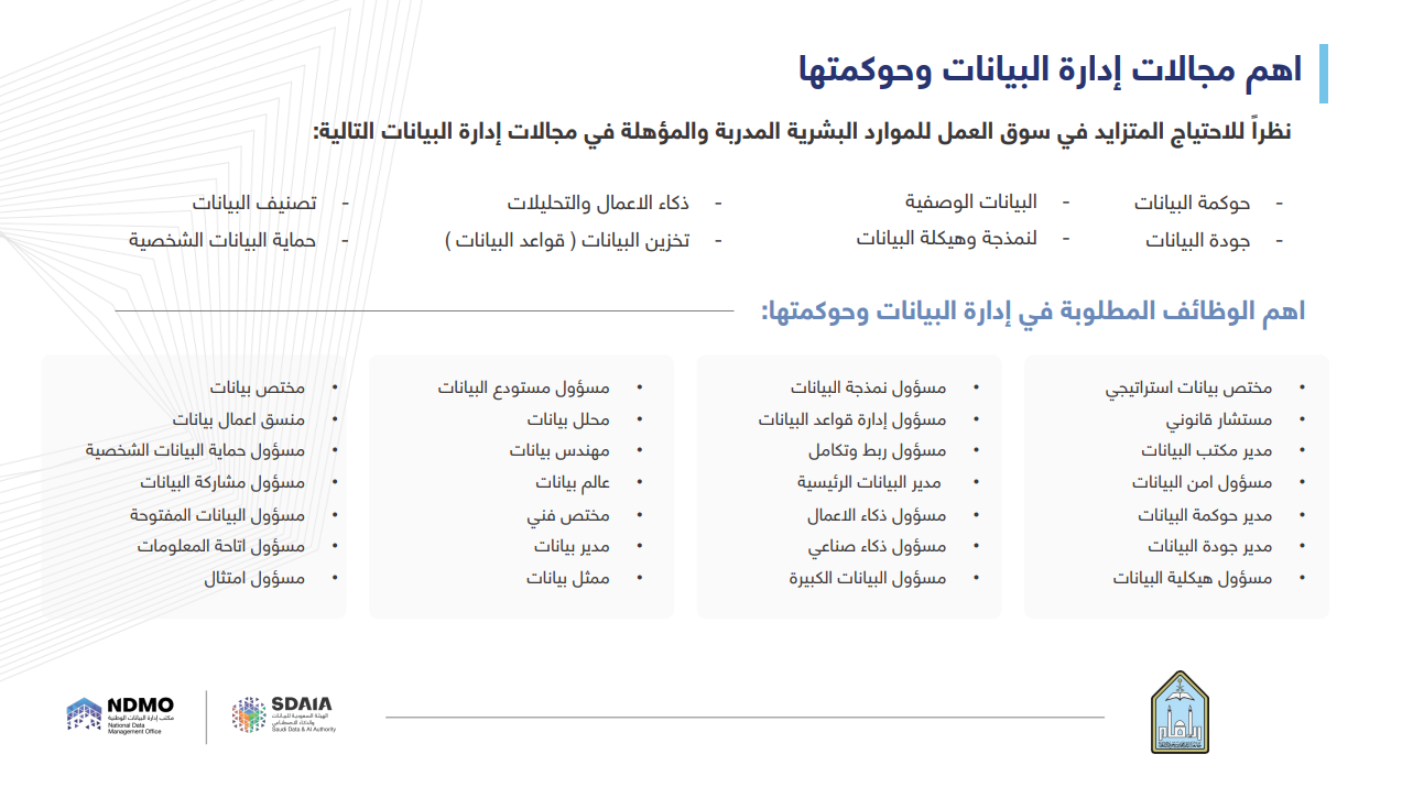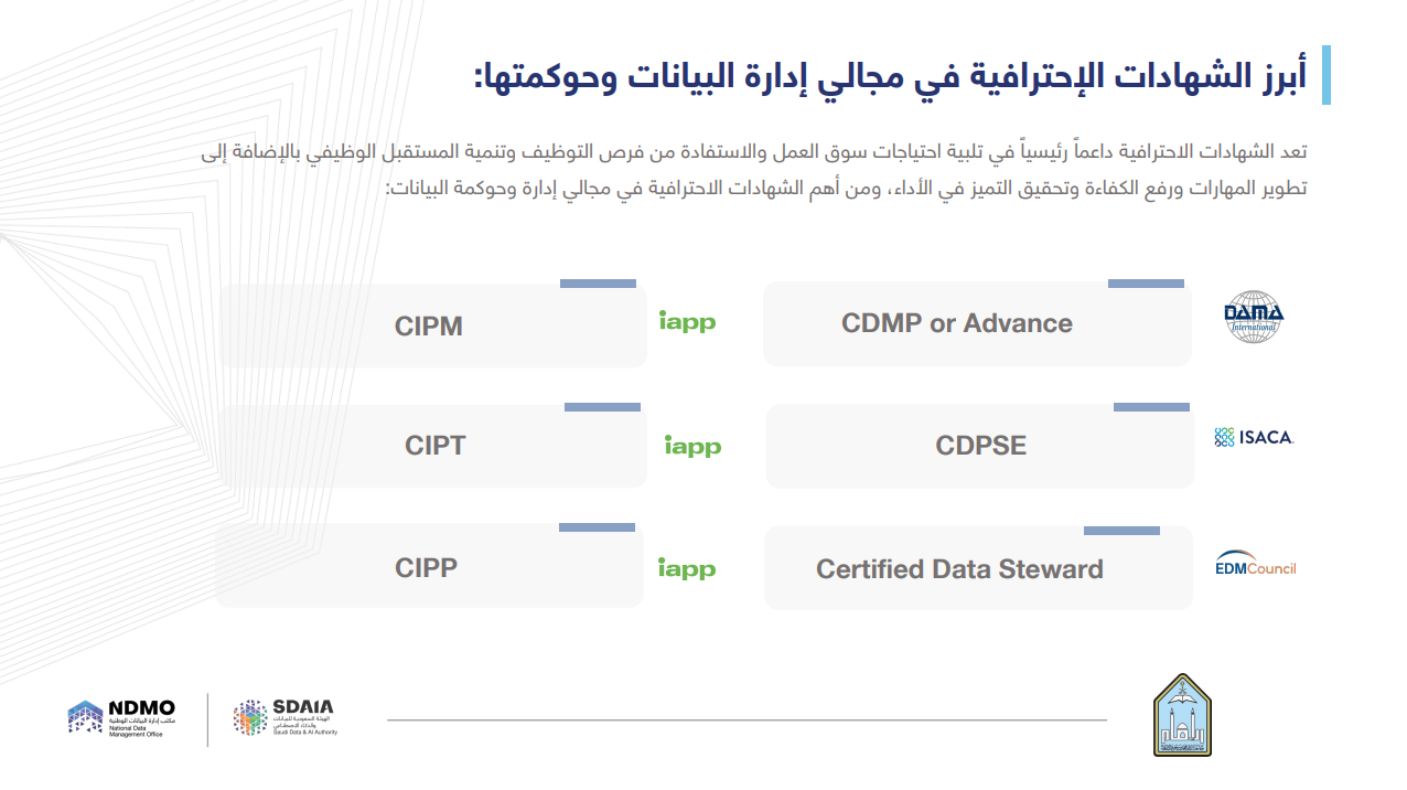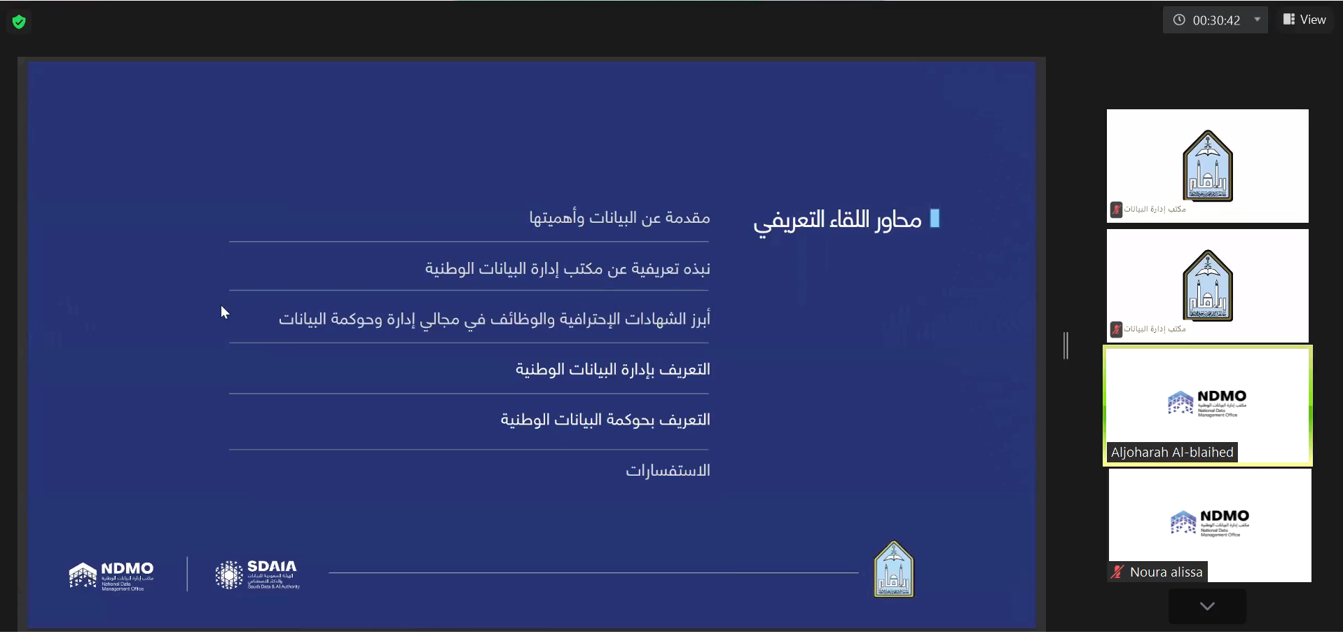 امتدادًا للتعاون القائم بين الجامعة ومكتب إدارة البيانات الوطنية بالهيئة السعودية للبيانات والذكاء الاصطناعي (سدايا)، نظم مكتب إدارة البيانات بعمادة تقنية المعلومات يوم الأحد 27-8-1444هـ الموافق 19-3-2023م لقاءً تعريفيًا افتراضيًا عن إدارة البيانات الوطنية وحوكمتها لطلاب وطالبات الجامعة قدمه مكتب إدارة البيانات الوطنية بالهيئة وذلك سعيا لتأهيل كوادر مدربة تحمل شهادات احترافية في حوكمة البيانات وإدارتها وتحقيقا لما ركزت عليه رؤية المملكة ٢٠٣٠ باعتبار البيانات هي الثروة القادمة التي يحرص على إدارتها كافة القطاعات والتي تعتبر أصل من الأصول الوطنية وإبرازًا لأهمية حوكمتها وإدارتها وحمايتها.