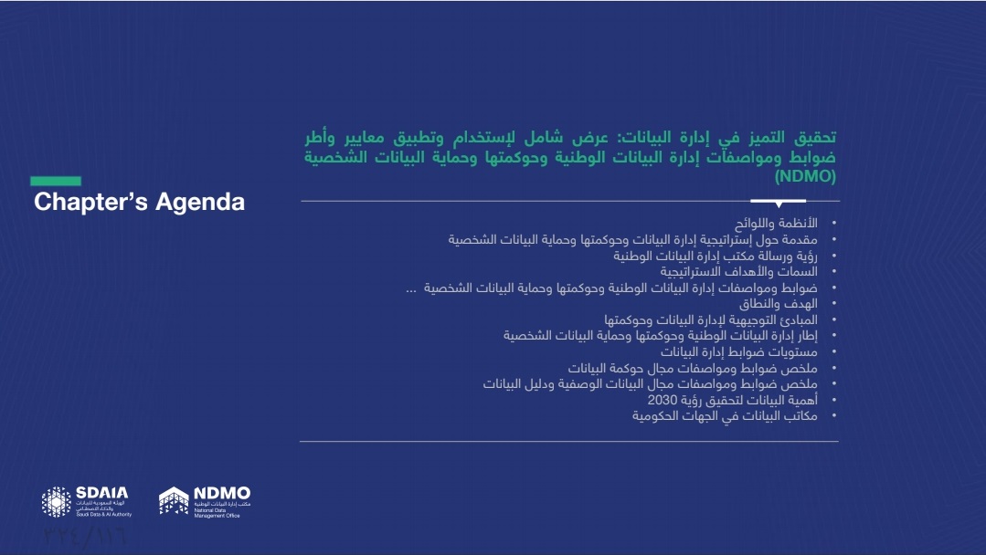 حيث تم عرض شامل لإستخدام وتطبيق معايير وأُطر ضوابط ومواصفات إدارة البيانات الوطنية وحوكمتها وحماية البيانات الشخصية، وتزويد المشاركين بالإرشادات والأدوات العملية لإنشاء استراتيجيات قوية ومستدامة لإدارة البيانات لجميع الجهات الحكومية وغير الحكومية بما يتماشى مع إستراتيجيات الجهة.