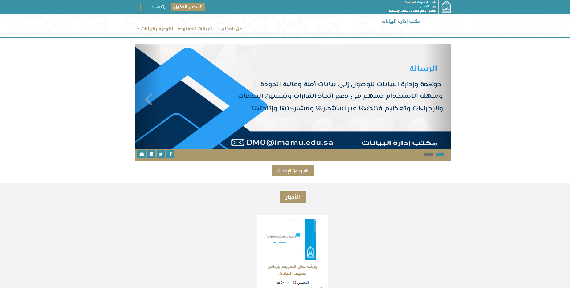 ​​تم بحمد الله إطلاق الموقع الالكتروني لمكتب إدارة البيانات بعمادة تقنية المعلومات  يجمع كافة المعلومات المتعلقة بمكتب إدارة البيانات وأنشطته، حيث تعرض الصفحة الرئيسة للموقع أهم الأخبار والإعلانات للمكتب، كما يشمل على معلومات عن المكتب، ورؤيته، ورسالته، وأهدافه. ويحتوي على سياسات إدارة البيانات وحوكمتها وحماية البيانات الشخصية، وكذلك على البرامج التوعوية عن البيانات واستخدامها​.​