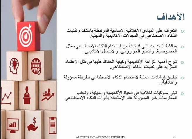 أقامت عمادة شؤون الطلاب ممثلةً بوحدة رعاية المتفوقين والموهوبين وبالتعاون مع إدارة البرامج التدريبية، دورة تدريبية مسائية بعنوان: أخلاقيات الذكاء الاصطناعي والنزاهة الأكاديمية "التوازن بين الابتكار والمسؤولية "من تقديم المدربة أ.د. صفاء عبد الحليم، وبشهادات حضور معتمدة ،كان ذلك في يوم الثلاثاء التاسع العشرين من شهر أبريل من العام ألفين وخمسة وعشرين من السنة الميلادية، وقد جاءت تلك الدورة محققةً لعددٍ من المحاور والأهداف منها: التعرف على المبادئ الأخلاقية الأساسية المرتبطة باستخدام تقنيات الذكاء الاصطناعي في المجالات الأكاديمية والمهنية، ومناقشة التحديات التي قد تنشأ من استخدام الذكاء الاصطناعي، مثل الخصوصية والتحيز الخوارزمي والانتحال الأكاديمي، وكذا شرح أهمية النزاهة الأكاديمية وكيفية الحفاظ عليها في ظل الاعتماد المتزايد على تقنيات الذكاء الاصطناعي من خلال تطبيق إرشادات عملية لاستخدام الذكاء الاصطناعي بطريقة مسؤولة وأخلاقية مع تبني السلوكيات الأخلاقية في حياتهم الأكاديمية والمهنية وتجنب الممارسات غير المسؤولة، دورة تدريبية حددت أسس الاستخدام المسؤول لأدوات الذكاء الاصطناعي وأخلاقياته وإرشاداته.