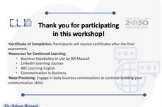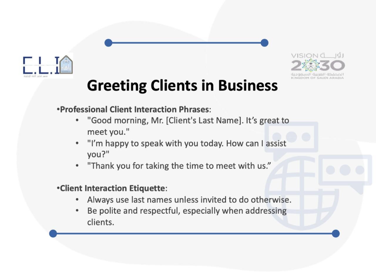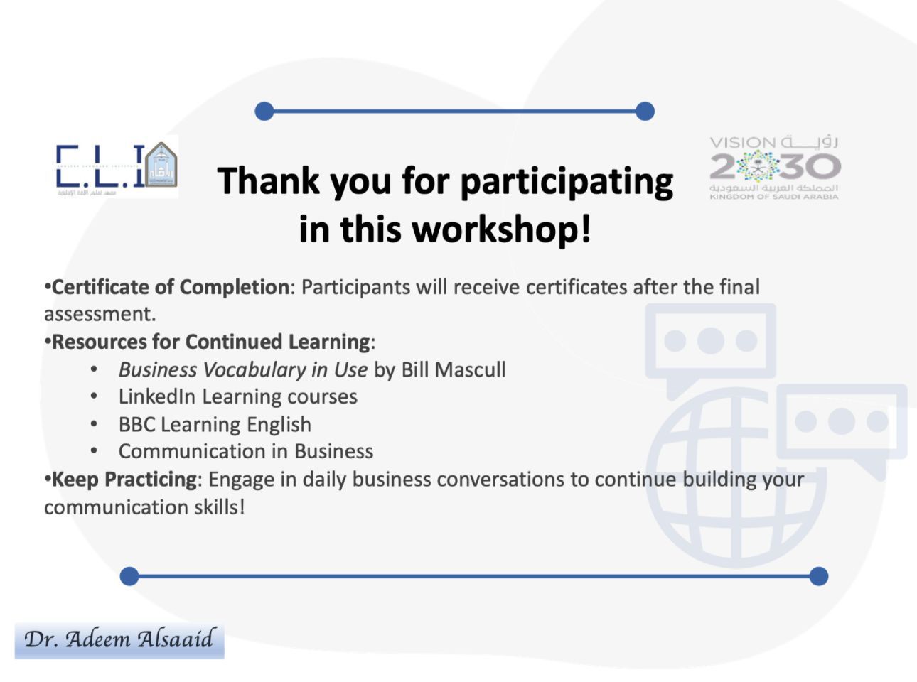 أقامت عمادة شؤون الطلاب ممثلةً بوحدة رعاية المتفوقين والموهوبين وبالتعاون مع معهد تعليم اللغة الإنجليزية ورشة عمل مسائية بعنوان: "Building Professional First Impressions" من تقديم المدربة د. أديم السعيد وبشهادات حضور معتمدة، كان ذلك على امتداد يومين ابتداءً من يوم الثلاثاء الثاني والعشرين من شهر أبريل من العام ألفين وخمسة وعشرين من السنة الميلادية، حيث تم تنفيذ تلك الورشة عبر منصة ويبكس بمجمل أربع ساعات تدريبية، فقد جاءت تلك الورشة للحديث عن "بناء الانطباعات المهنية الأولى" وتناولت محاور ثلاثة كانت على النحو التالي: "Introducing Yourself and Your Job" من خلال آلية التعريف بالنفس والمهارات والخبرات والشهادة العلمية وغيرها من المؤهلات والمكتسبات الوظيفية المطلوبة بمهارة الاختصار والإيفاء والثقة والثقافة المعرفية، يليها الحديث عن "Greeting Colleagues and Clients" والطريقة المناسبة لتحية الزملاء والعملاء والقدرة على اتقان فن التعامل مع الآخرين والقدرة على الغوص مع فريق العمل وفهم لغة الجسد مما يحقق بيئة عمل مناسبة، ومن ثم المحور الجوهري والذي يهدف إلى "Building Professional Relationships"بناء العلاقات المهنية عن طريق بناء شبكة قوية قائمة على السعي إلى التطوير والنجاح من خلال تطبيق فن التواصل الفعال، وكذا أهمية الوضوح والفعالية في مجال العمل، أيضًا تفعيل وسائل التواصل الاجتماعي المهني وحضور الفعاليات والدورات والمؤتمرات المهنية متبادلة المنافع والأفكار والخبرات والتجارب، والالتزام بالأخلاق المهنية الحميدة والتي تكون مبنية على الثقة والاحترام والمتبادل وتقديم المساعدة والدعم كما يجب الالتزام بالتعليم والاكتساب المستمر والذي يكون مفتاحًا للتطور المهني في شتى المجالات المختلفة.
