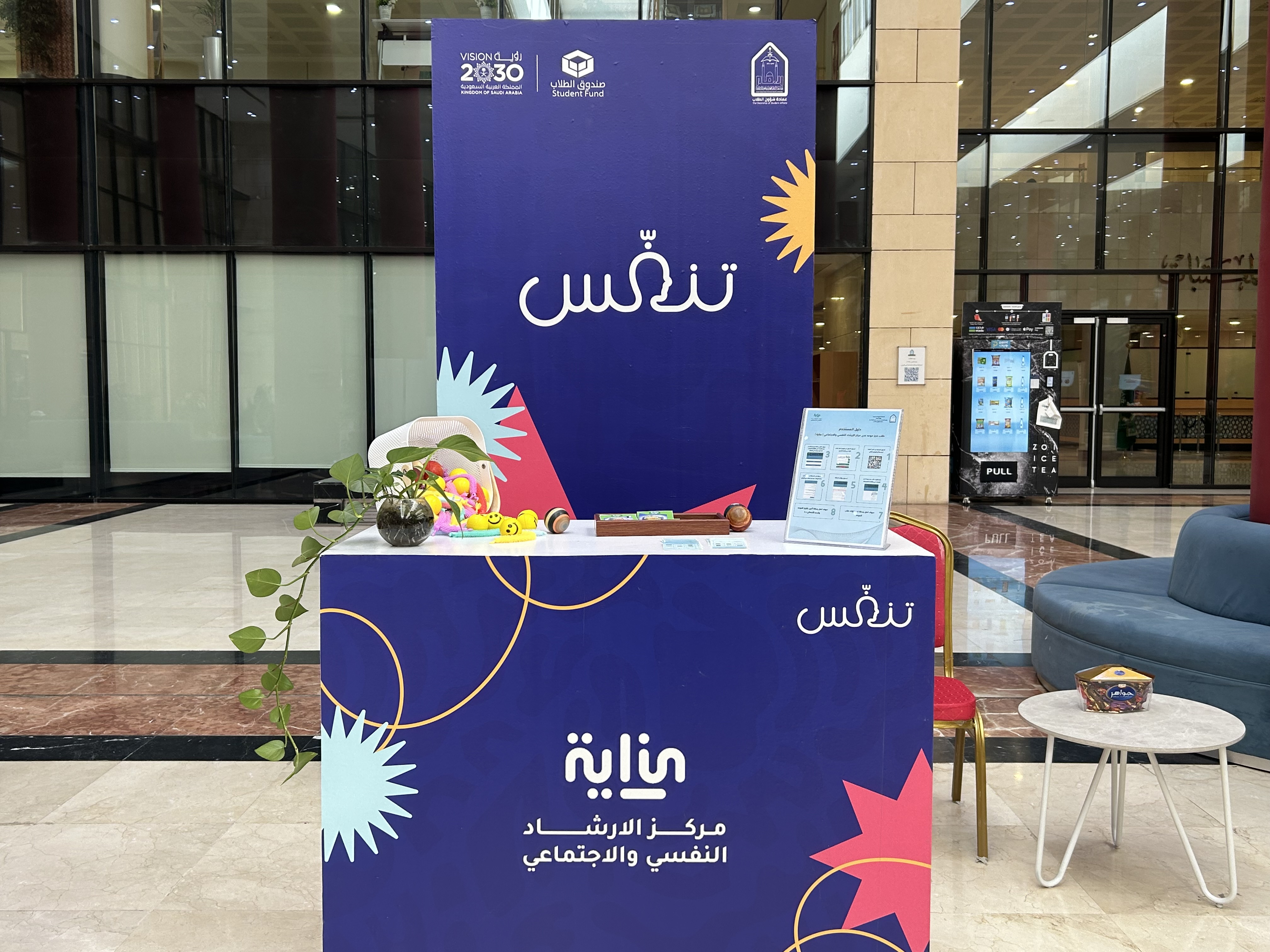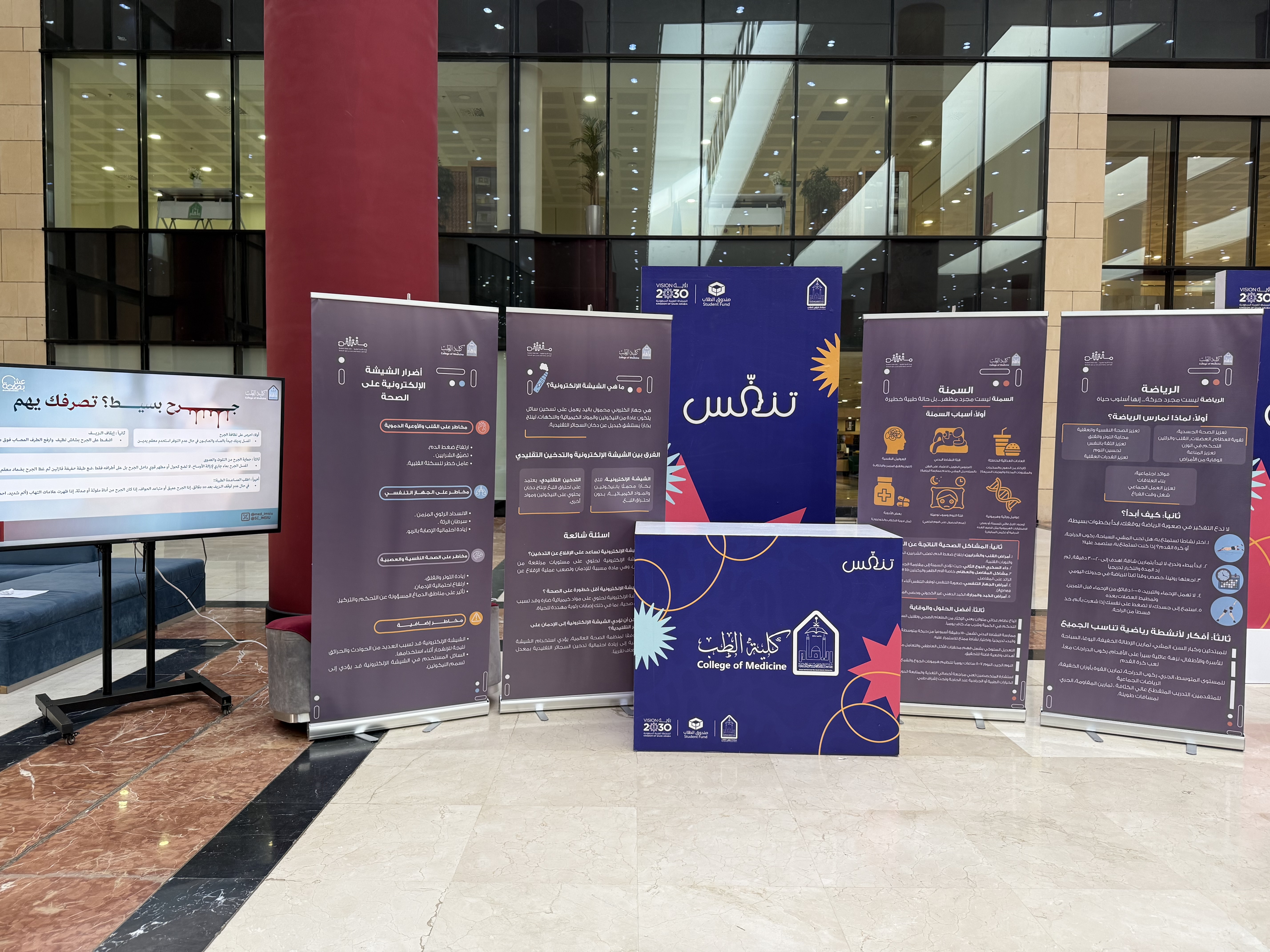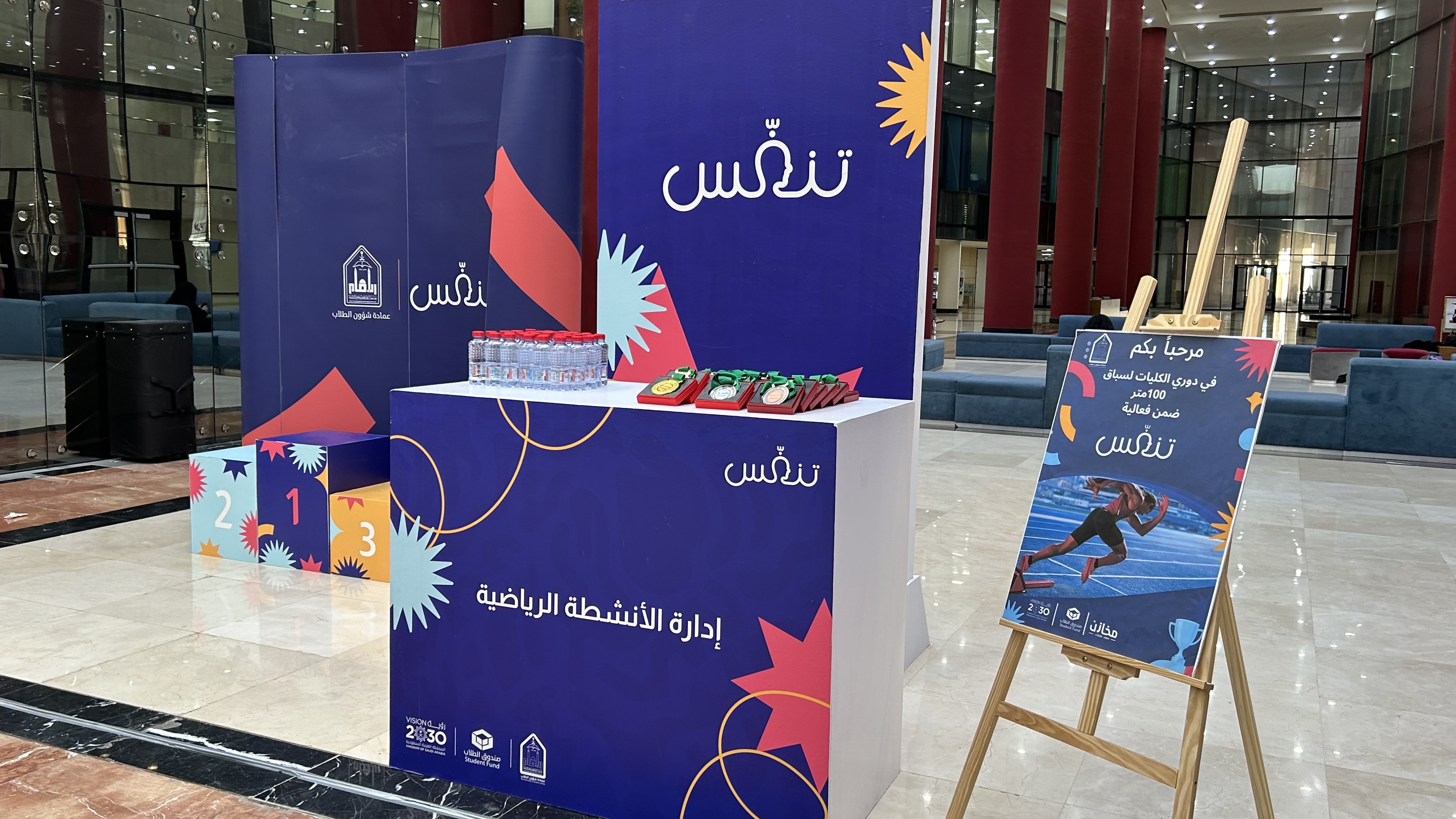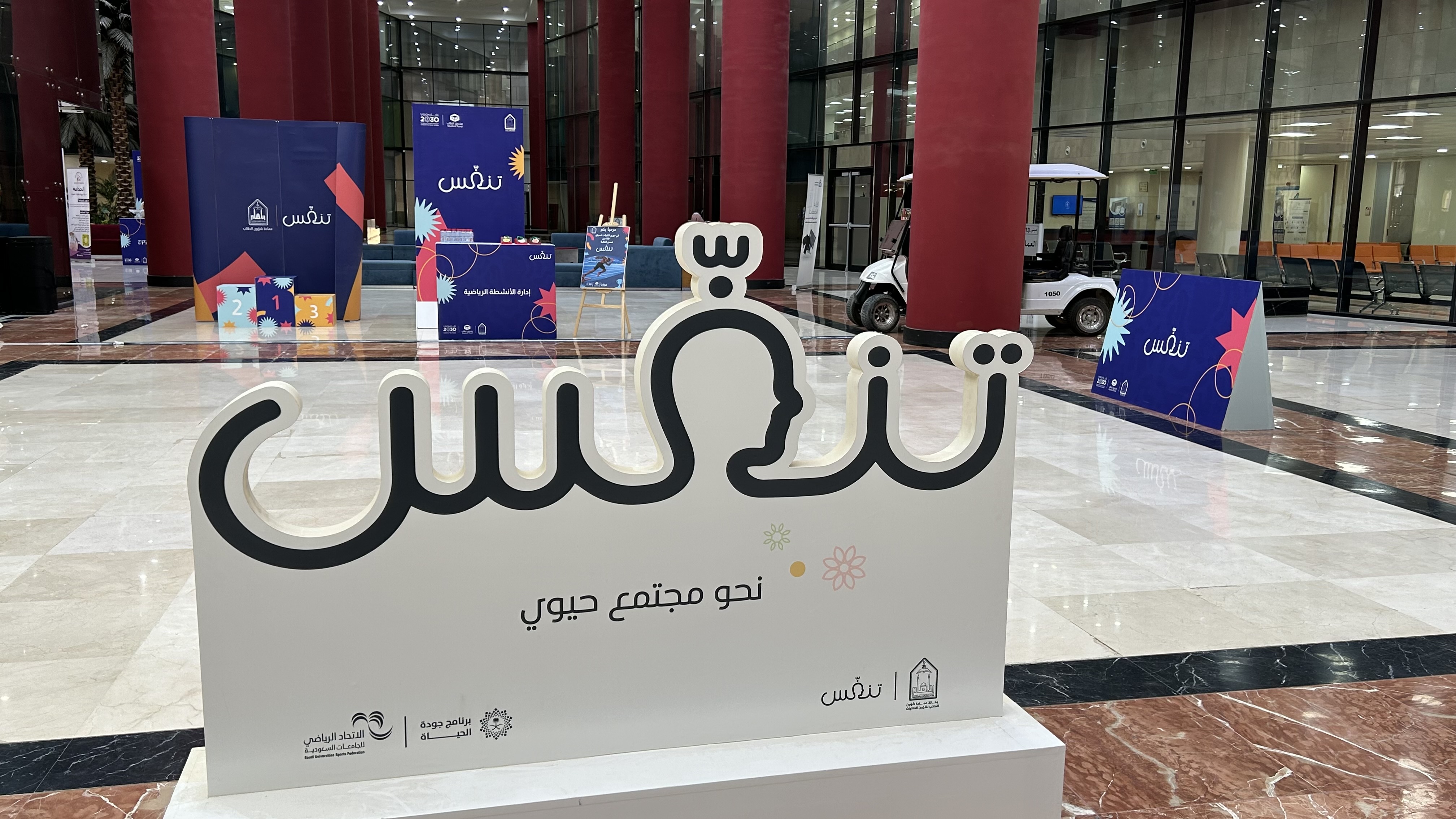 برعاية سعادة وكيلة الجامعة للتطوير المؤسسي والمسؤولية المجتمعية د. خلود بنت فواز التميمي وبدعم من صندوق الطلاب نظّمت عمادة شؤون الطلاب برنامج تنفس بنسخته الرابعة، وذلك يومي الأحد والاثنين الخامس والعشرين والسادس والعشرين من شهر يناير من العام ألفين وستة وعشرين من السنة الميلادية من الساعة التاسعة صباحًا وحتى الواحدة مساءً بمبنى المؤتمرات 416، حيث دشنت سعادة وكيلة الجامعة للتطوير المؤسسي والمسؤولية المجتمعية د. خلود بنت فواز التميمي هذا المعرض وذلك بحضور سعادة وكيلة عمادة شؤون الطلاب لشؤون الطالبات د. عهود بنت عثمان المنيع وجمعُ من منسوبات الجامعة وطالباتها إلى جانب مجموعة كبيرة من الجهات المشاركة، يأتي ذلك ضمن إطار حرص عمادة شؤون الطلاب على دعم المبادرات الصحية والاجتماعية وتعزيز جودة الحياة الجامعية، شهدت الفعالية مشاركة فعّالة من مختلف الجهات الداعمة والمتعاونة، التي أسهمت في إثراء محتوى الفعالية من خلال تقديم برامج توعوية وتثقيفية متخصصة ليعكس ذلك التكامل بين الجامعة والقطاعات المختلفة لخدمة المجتمع الجامعي، ودعم مستهدفات رؤية المملكة 2030 في تعزيز الصحة وجودة الحياة، كما جاء صندوق الطلاب كداعم للفعالية، فيما شاركت مخازن ماركت بصفة الداعم الرسمي، تأكيدًا لدور الشراكات المجتمعية في دعم المبادرات الجامعية الهادفة، وقد عبرت الدكتورة عهود بنت عثمان المنيع في كلمة لها عن أهمية إقامة مثل هذه البرامج، مشيرة إلى دورها الحيوي في تعزيز الصحة الجسدية والنفسية للطالبات، وأثره الإيجابي في تحسين جودة الحياة وتقليل التوتر اليومي، داعية إلى اعتماد أنماط حياة صحية داخل الحرم الجامعي وخارجه، كما تضمنت الفعالية إقامة عدد من الورش الفنية والتفاعلية المتخصصة بالأزياء والفخار، كما اشتملت الفعالية على أنشطة مصاحبة من أركان للألعاب الرياضية الحركية، لتشجيع الطالبات على ممارسة الأنشطة البدنية بطريقة ممتعة وتفاعلية، وأركان تعريفية للجهات المشاركة تضمنت جهات صحية وتوعوية وجمعيات خيرية ومؤسسات مجتمعية، قدمت خلالها الاستشارات والتعريف بالخدمات والبرامج المقدمة للطالبات، إلى جانب التفاعل المباشر والإجابة على الاستفسارات، مما أسهم في توفير تجربة شاملة ومتكاملة لطالبات الجامعة ومنسوباتها، وقد شملت الجوائز المقدمة من الداعم الرسمي مخازن ماركت للفائزات في مسابقة الجري: