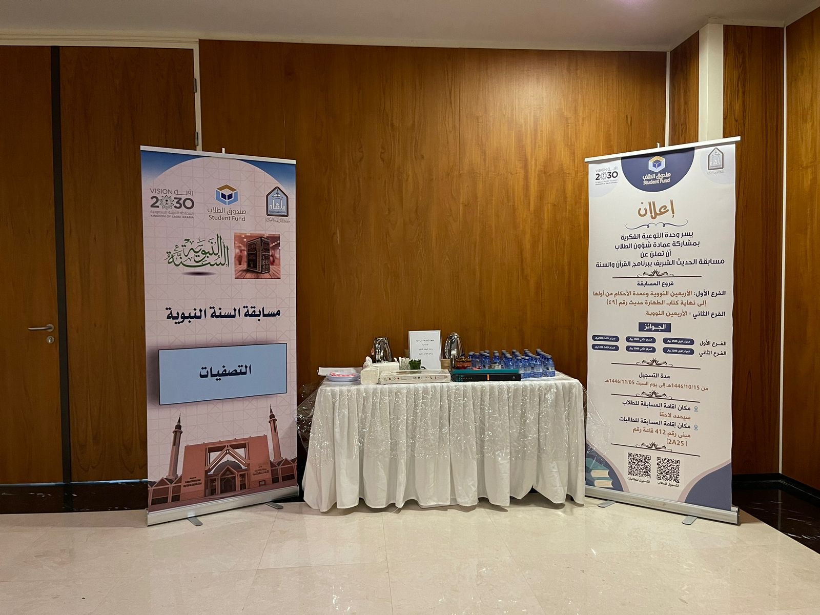 بتعاون من عمادة شؤون الطلاب؛ أقامت وحدة التوعية الفكرية وبدعم من صندوق الطلاب مسابقة الحديث الشريف ببرنامج القرآن والسنة بفرعيها الفرع الأول: عمدة الأحكام من أولها إلى باب الطهارة الحديث التاسع والأربعين وكتاب الأربعون النووية كاملة، والفرع الثاني: كتاب الأربعون النووية لطلاب الجامعة وطالباتها، كان ذلك في يومي الخميس والأحد الثامن والحادي عشر من شهر مايو من العام ألفين وخمسة وعشرين من السنة الميلادية، بإشراف كلٍ من القائم على المسابقة فضيلة الشيخ المستشار بالوحدة د. عبد الله بن عباس الظاهري ومديرة برنامج القرآن والسنة أ. نجلاء بنت عبد الله القاسم، وبتحكيم من اللجنة المكونة من: د. عبد الله بن علي الروزي، و د. حسام بن عبد الله الحسين، و أ. صفاء بنت محمد المليباري، و أ. ندى بنت عبد الرحمن المهنا، وقد هنئت عمادة شؤون الطلاب ووحدة التوعية الفكرية الفائزون والفائزات بجوائز هذه المسابقة والتي جاءت على النحو التالي: الفرع الأول بمبلغ 3500 ريال الطالب: بو فراج بن فوزي ابركات، والطالبة: فاطمة سيد توصيف الرحمن، المركز الثاني بمبلغ 3000ريال الطالب: عبد الرحمن بن عبد الحكيم أوشاح، والطالبة: مها بنت عاطف القحطاني، والمركز الثالث بمبلغ 2500ريال الطالب: بلال حسين، والطالبة: رانية بنت محمد الكيعني، أما الفرع الثاني ففي المركز الأول بمبلغ 2200ريال الطالب: محمد بن سعيد محمود والطالبة: ليلى بنت فهد العقيلي، والمركز الثاني بمبلغ 2000ريال الطالب: عبد الكريم بن إسماعيل، والطالبة: هاجر بنت وليد إبراهيم، والمركز الثالث بمبلغ 1450ريال الطالب: معاذ الأنصاري، والطالبة شيماء بنت عبد الله الظاهري.
