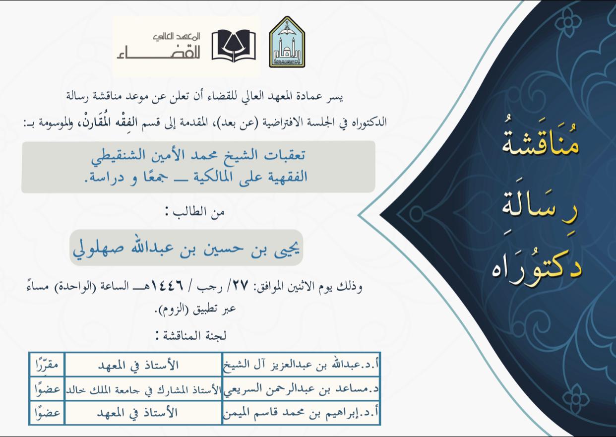 مناقشة رسالة الدكتوراه للطالب/ يحيى بن حسين بن عبدالله صهلولي