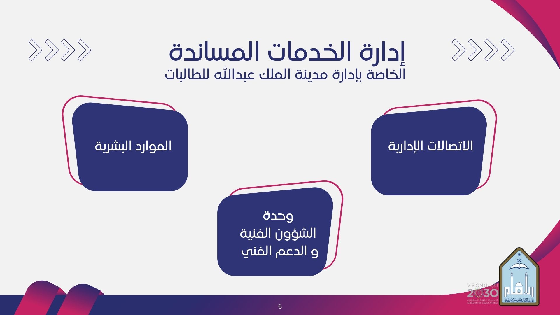 تقديم الخدمات الفنية واللإدارية للإدارات والوحدات التابعة لللإدارة العامة لمدينة الملك عبدالله للطالبات,والتي تمكنها من تحقيق أهدافها، والقيام بمهامها بكفاءة وفعالية.