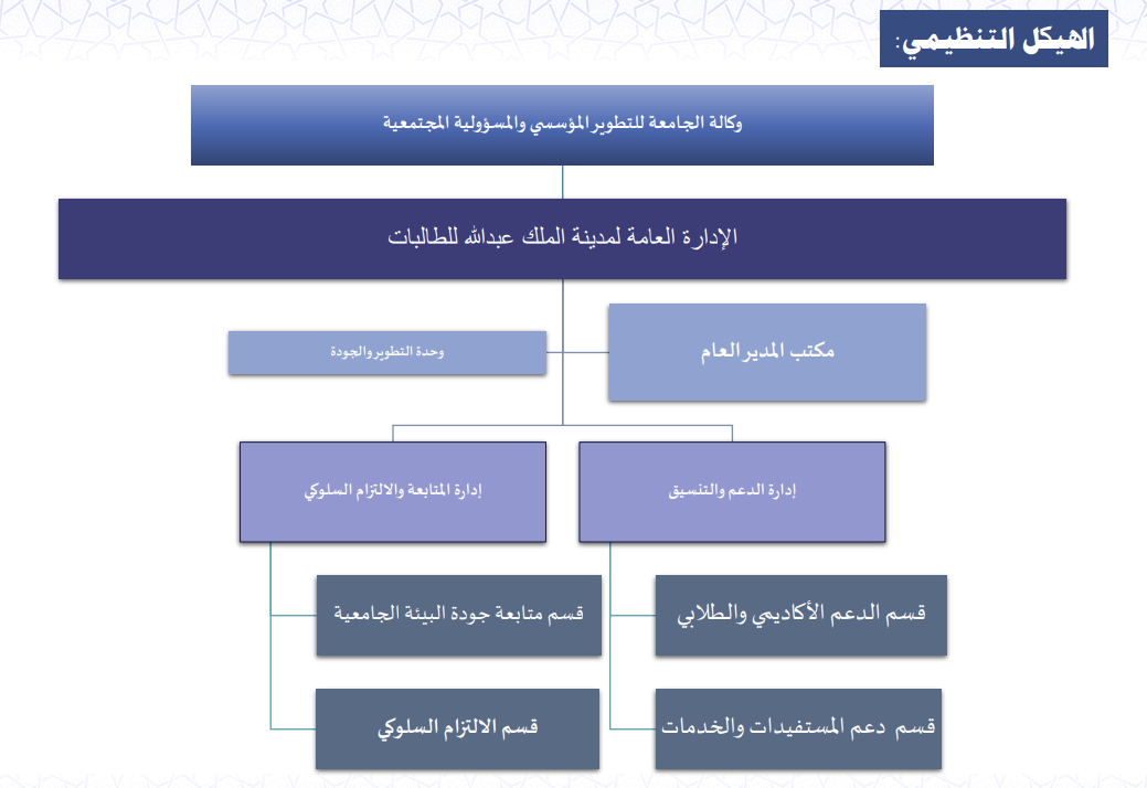 3- إدارة شؤون مدينة الملك عبد الله للطالبات وما يتعلق بها من جوانب فكرية واجتماعية ونفسية وخدمية ودعم ومتابعة الإجراءات اللازمة لتحسينها وتطويرها بالتنسيق مع وكيل الجامعة للتطوير المؤسسي والمسؤولية المجتمعية ووحدات الجامعة المختلفة ذات الاختصاص.