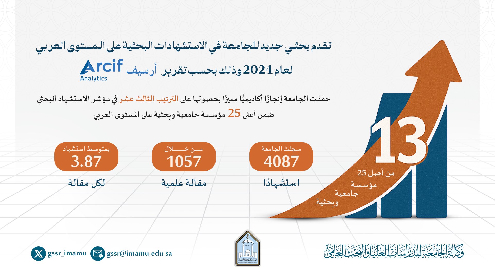 ​​​​​​​​حققت جامعة الامام محمد بن سعود الإسلامية إنجازًا أكاديميًا مميزًا بحصولها على الترتيب الثالث عشر في مؤشر الاستشهاد البحثي ضمن أعلى 25 مؤسسة جامعية وبحثية على المستوى العربي، وذلك وفقًا لتقرير معامل التأثير والاستشهادات المرجعية العربي (أرسيف) السنوي للعام 2024م.​