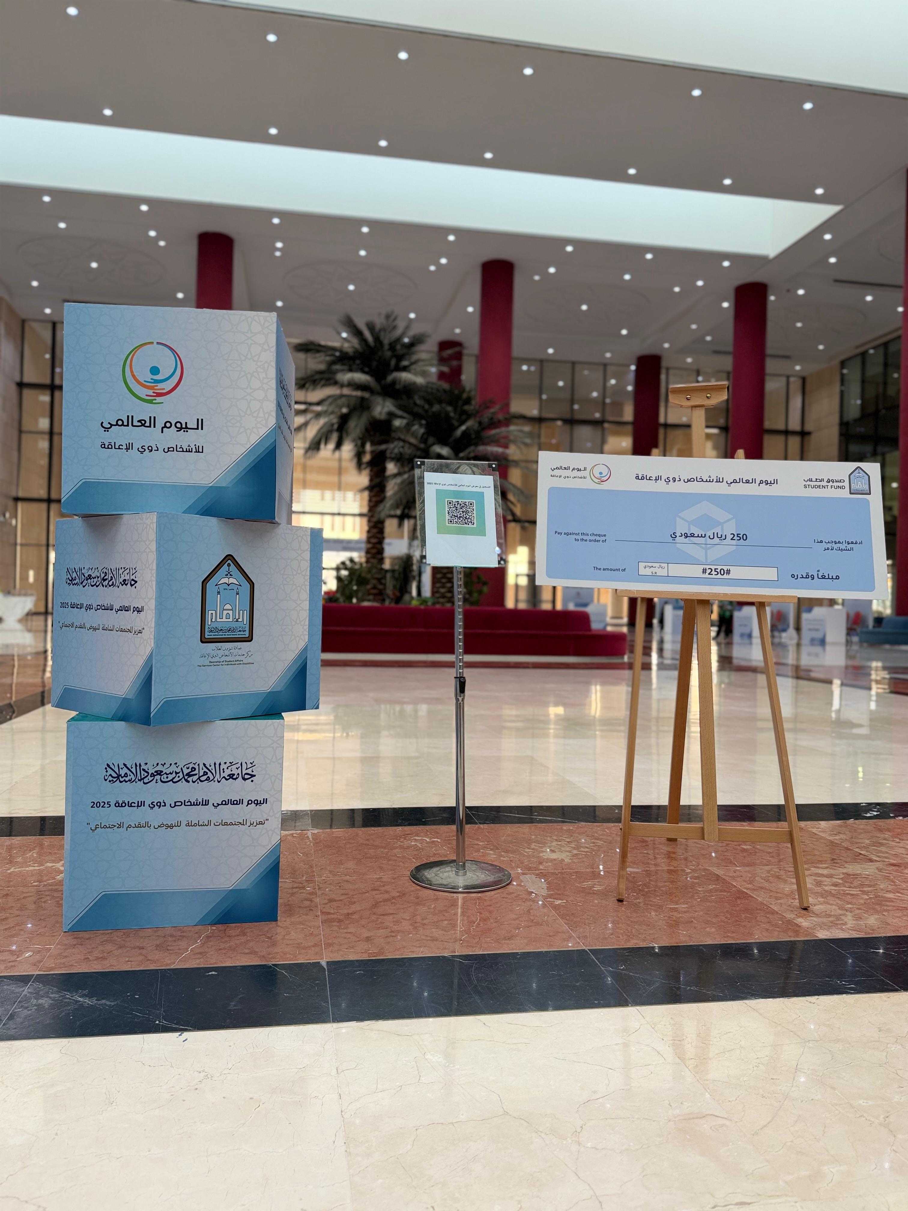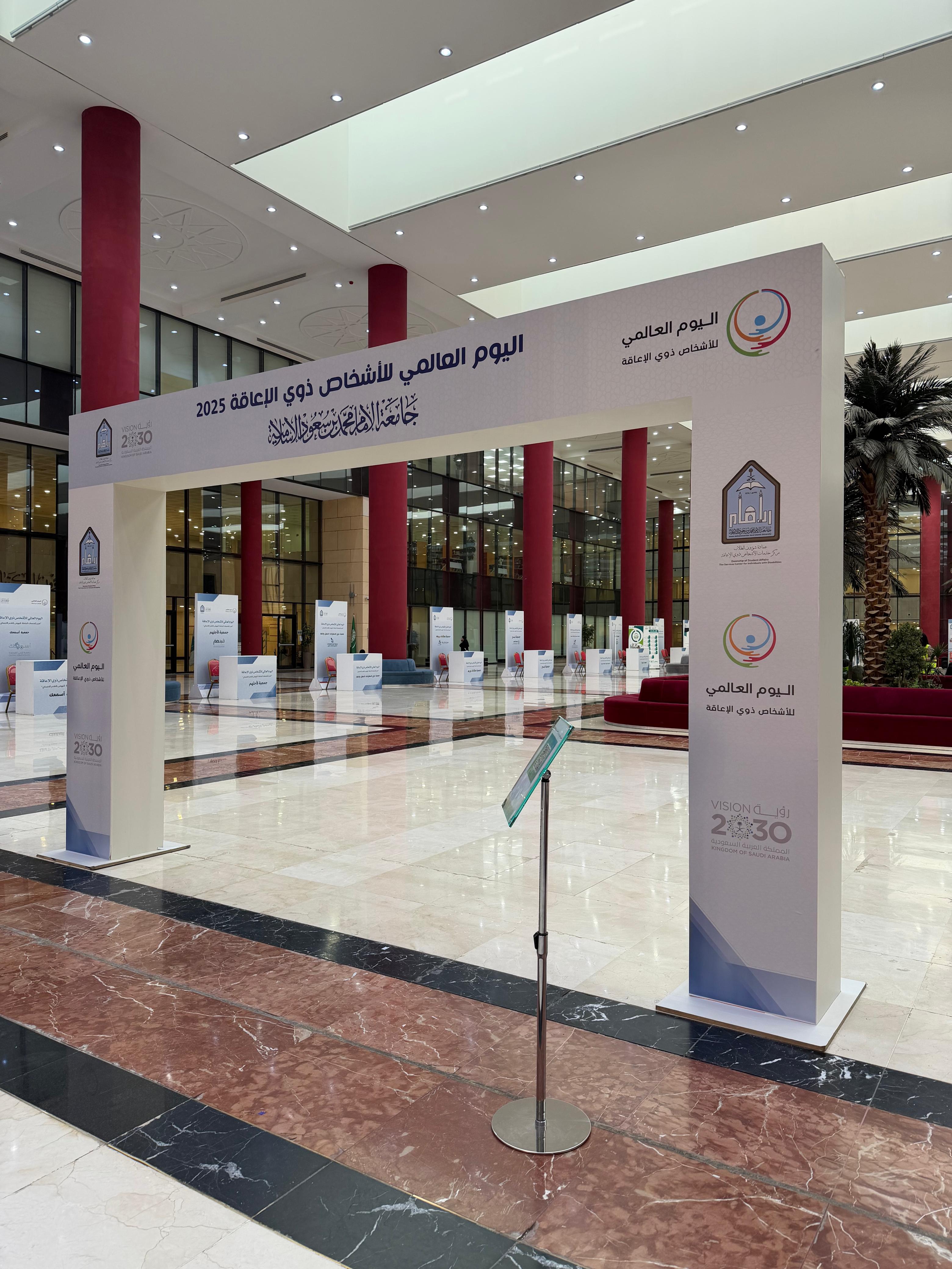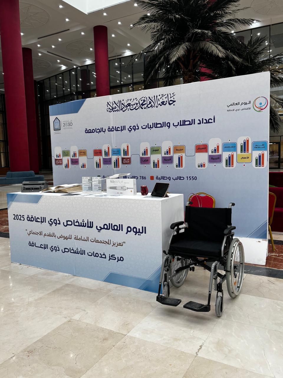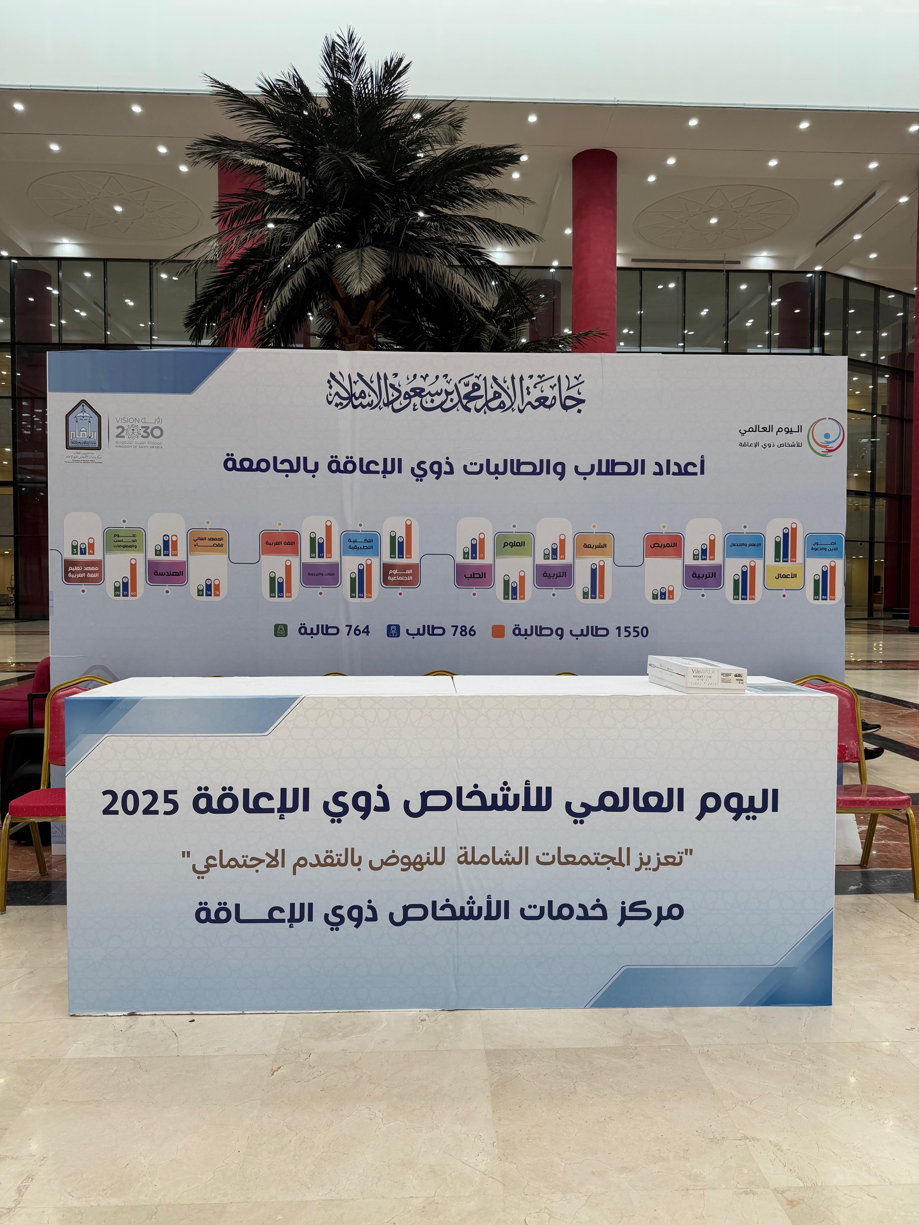 دعماً لجهود الجامعة في تعزيز الشمولية وتمكين الأشخاص ذوي الإعاقة، وتحت رعاية معالي رئيس جامعة الإمام أ.د. أحمد بن سالم العامري، تفتتح سعادة وكيلة الجامعة للتطوير المؤسسي والمسؤولية المجتمعية د. خلود بنت فواز التميمي بتنظيم من عمادة شؤون الطلاب فعاليات اليوم العالمي للأشخاص ذوي الإعاقة، وذلك يوم الثلاثاء الموافق ٩ ديسمبر ٢٠٢٥م، من الساعة التاسعة حتى العاشرة صباحًا.