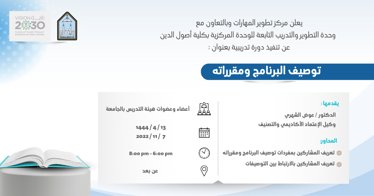 يعلن مركز تطوير المهارات عن تنفيذ دورة تدريبية بعنوان ( توصيف البرنامج ومقرراته )