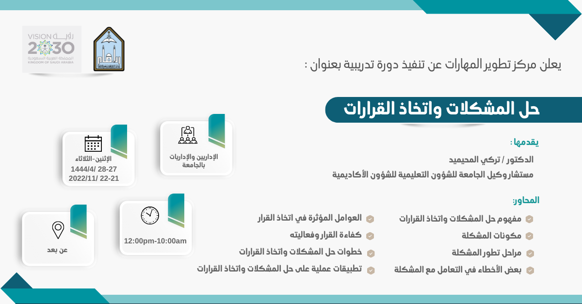 يعلن مركز تطوير المهارات عن تنفيذ دورة تدريبية بعنوان (حل المشكلات واتخاذ القرارات)