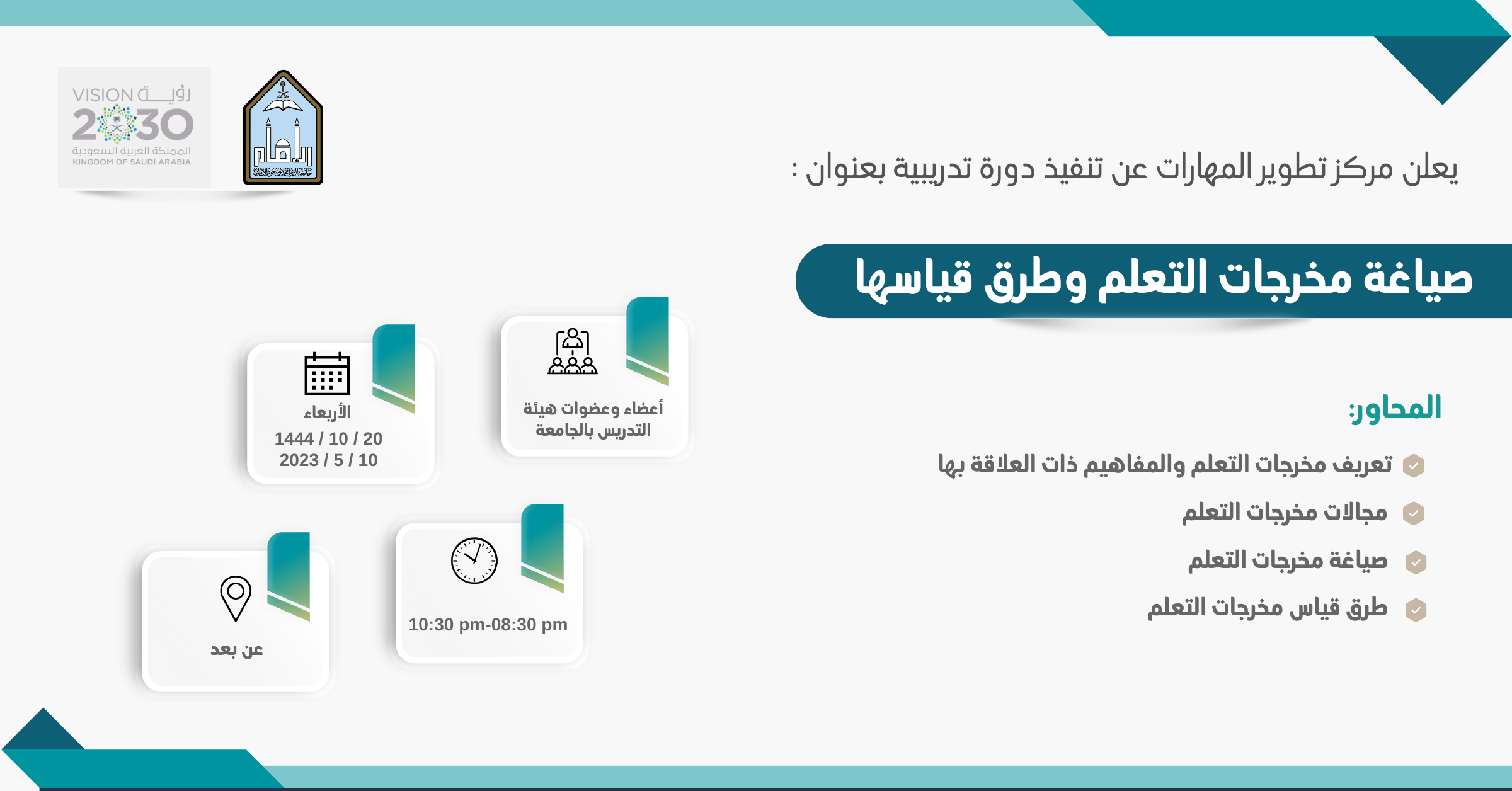 يعلن مركز تطوير المهارات تنفيذ دورة تدريبية بعنوان (صياغة مخرجات التعلم وطرق قياسها)