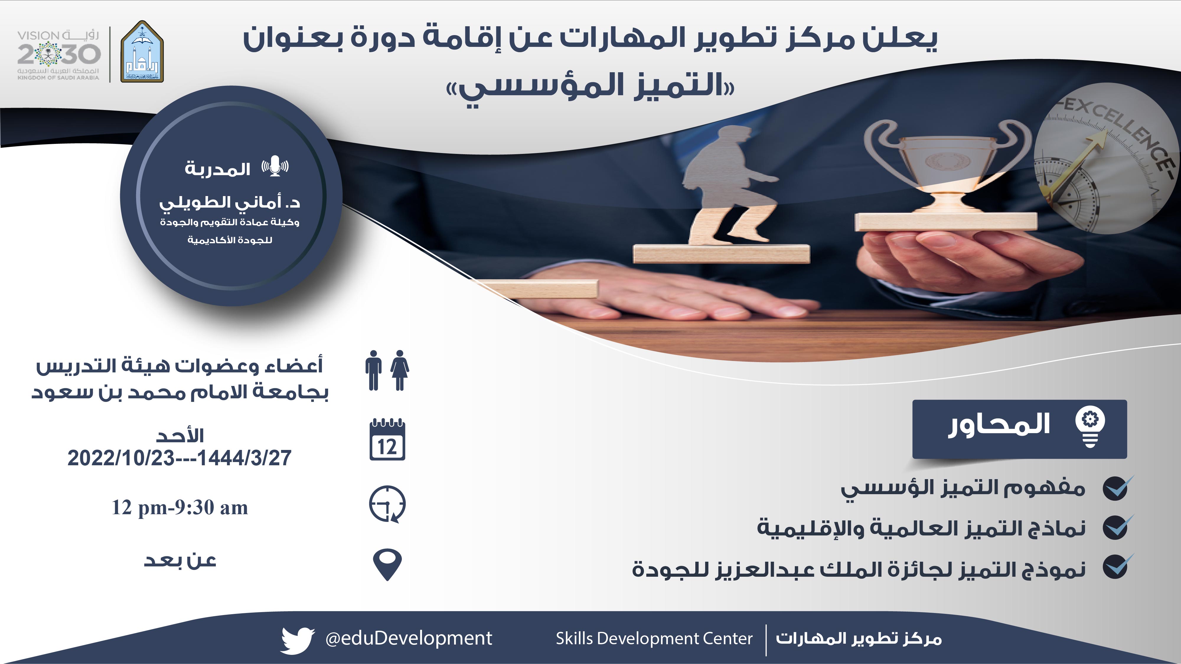 يعلن مركز تطوير المهارات عن اقامة دورة بعنوان " التميز المؤسسي " المقامة عن بعد