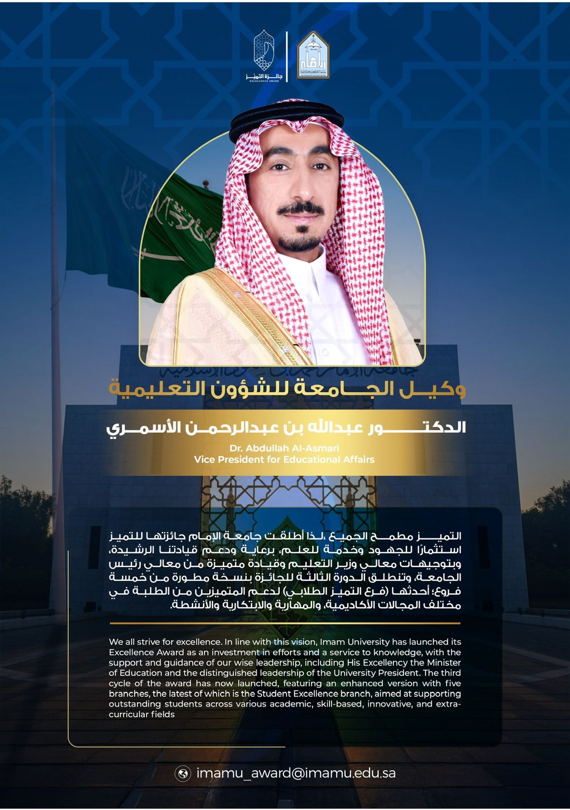 التميز مطمح لأي مؤسسة أو فرد، ويعد أعلى مراتب الجودة، فلا تميز بلا جودة، ووجود جوائز للتميز يسهم في رفع مستوى جودة الأداء ويزيد من وتيرة التحسين المستمر. لذلك أطلقت جامعة الإمام محمد بن سعود الإسلامية جائزتها للتميز بصورتها الحالية منذ أربع سنوات، وفي كل نسخة تحل علينا بحلة جديدة لتضمن لنا تميزها الذي هو جزء من اسمها، كل هذا التميز استثمارًا للجهود المبذولة من حكومة مولاي خادم الحرمين الشريفين الملك سلمان بن عبدالعزيز آل سعود وسمو سيدي ولي العهد الأمين رئيس مجلس الوزراء صاحب السمو الملكي الأمير محمد بن سلمان -حفظهما الله-لخدمة العلم والمعرفة وبتوجهات معالي وزير التعليم وبقيادة متميزة داعمة للتميز والإبداع من معالي رئيس الجامعة أ.د. أحمد بن سالم العامري الذي وافق عليها كمبادرة قبل سنوات وهاهي اليوم واقع ملموس، وتنطلق هذا العام بنسخة مطورة من أربعة فروع؛ أحدثها (فرع التميز الطلابي) لدعم المتميزين من طلاب وطالبات الجامعة تعزيزًا للتنافس البناء في مختلف المجالات الأكاديمية والمهارية والابتكارية والأنشطة المختلفة.