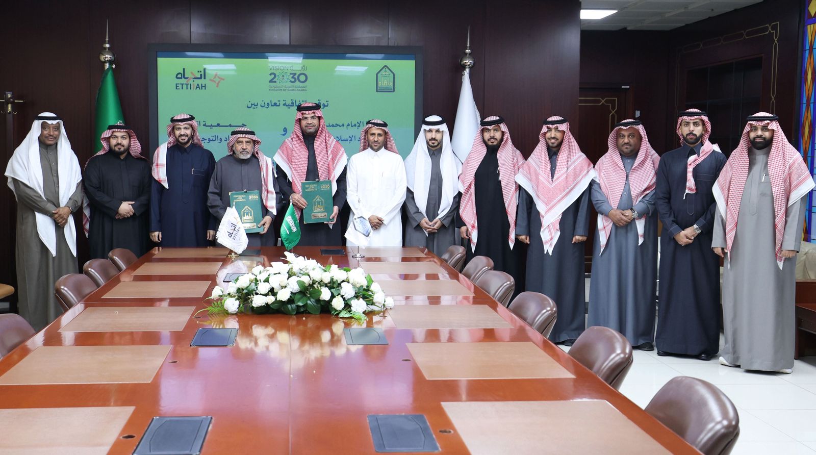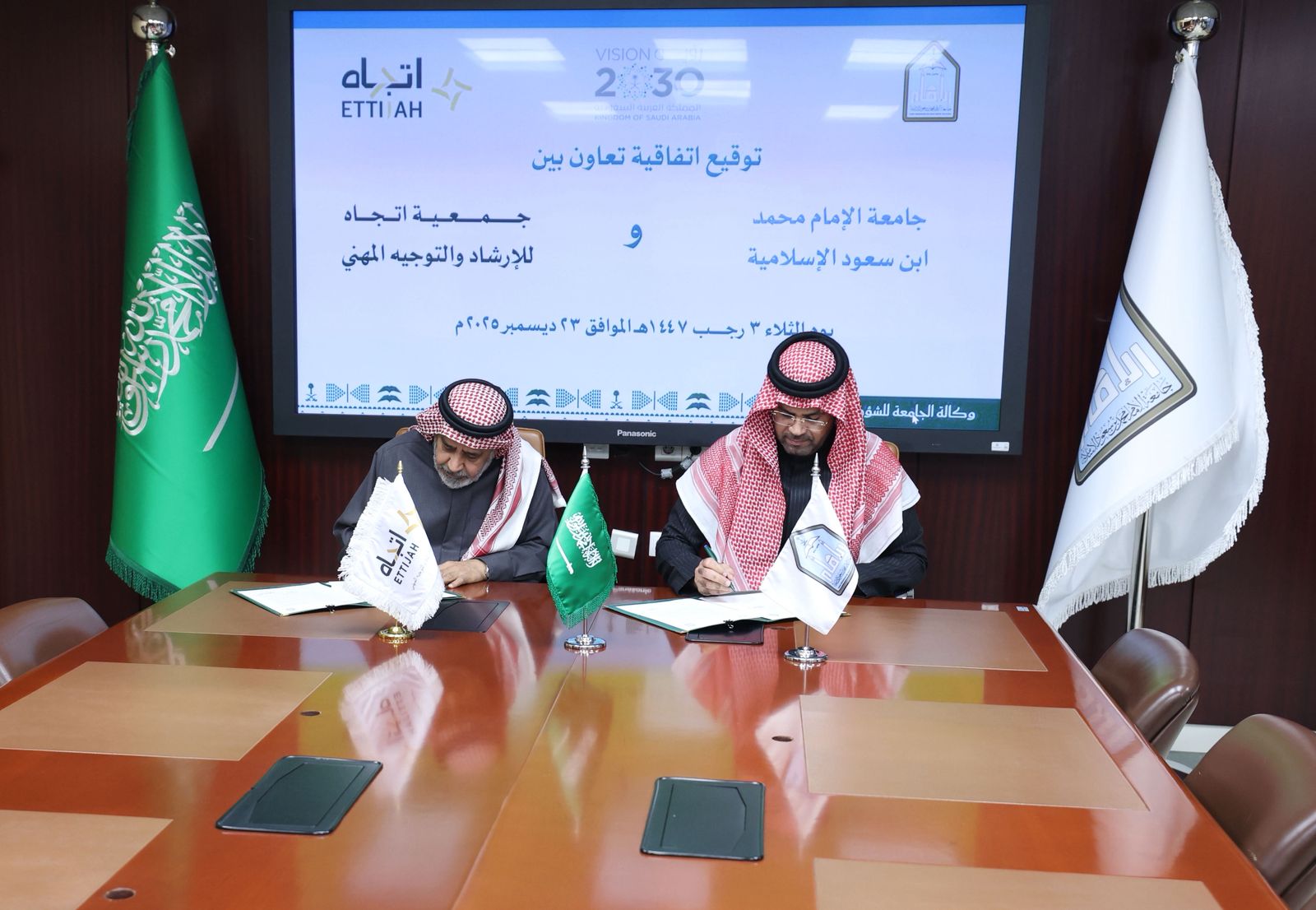 بدعم من معالي رئيس جامعة الإمام محمد بن سعود الإسلامية الأستاذ الدكتور/ أحمد بن سالم العامري، وبتوجيه سعادة وكيل الجامعة للشؤون التعليمية الدكتور/ عبدالله بن عبدالرحمن الأسمري، وقّعت جامعة الإمام محمد بن سعود الإسلامية يوم الثلاثاء 2 رجب 1447هـ اتفاقية تعاون مع جمعية اتجاه للإرشاد والتوجيه المهني، وذلك في إطار تعزيز الشراكة المجتمعية ودعم برامج الإرشاد والتوجيه المهني، وتمكين الطلبة من التخطيط لمساراتهم التعليمية والمهنية، وبناء قرارات مستقبلية واعية تتواءم مع متطلبات سوق العمل.