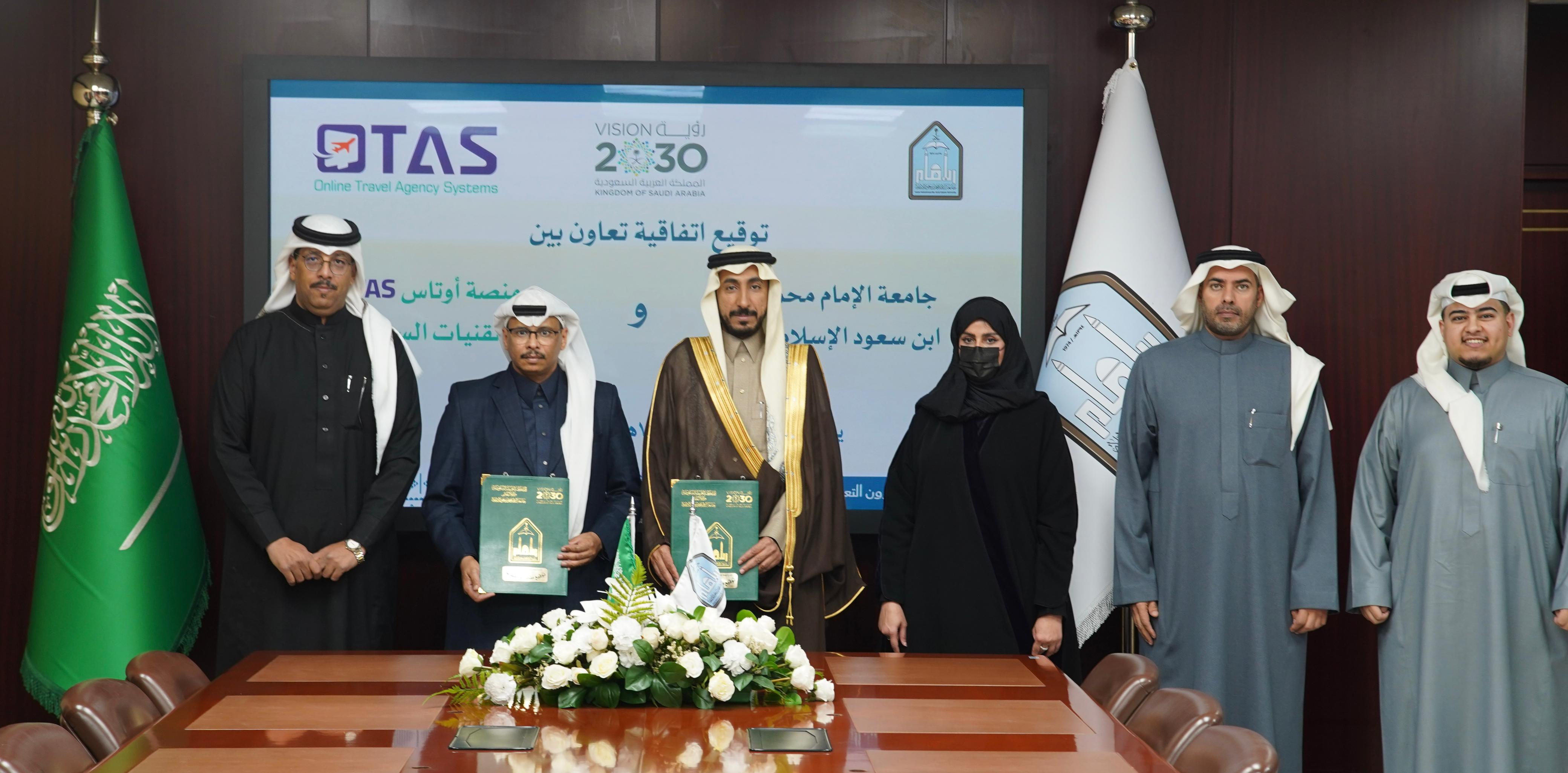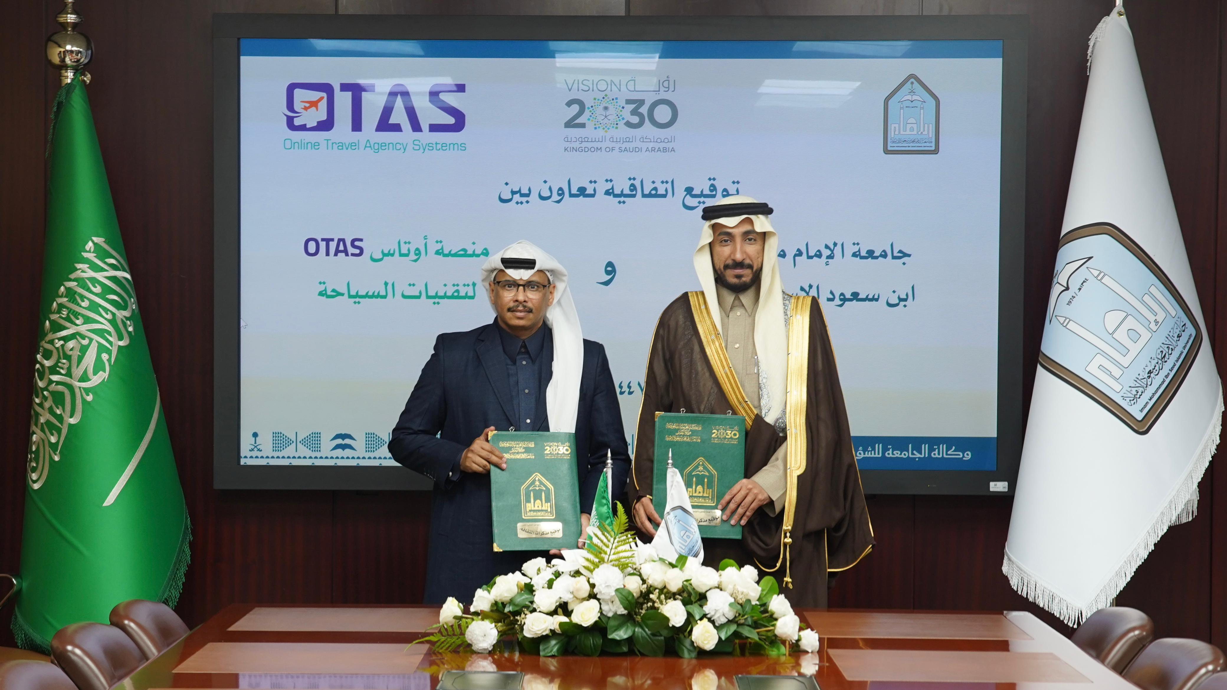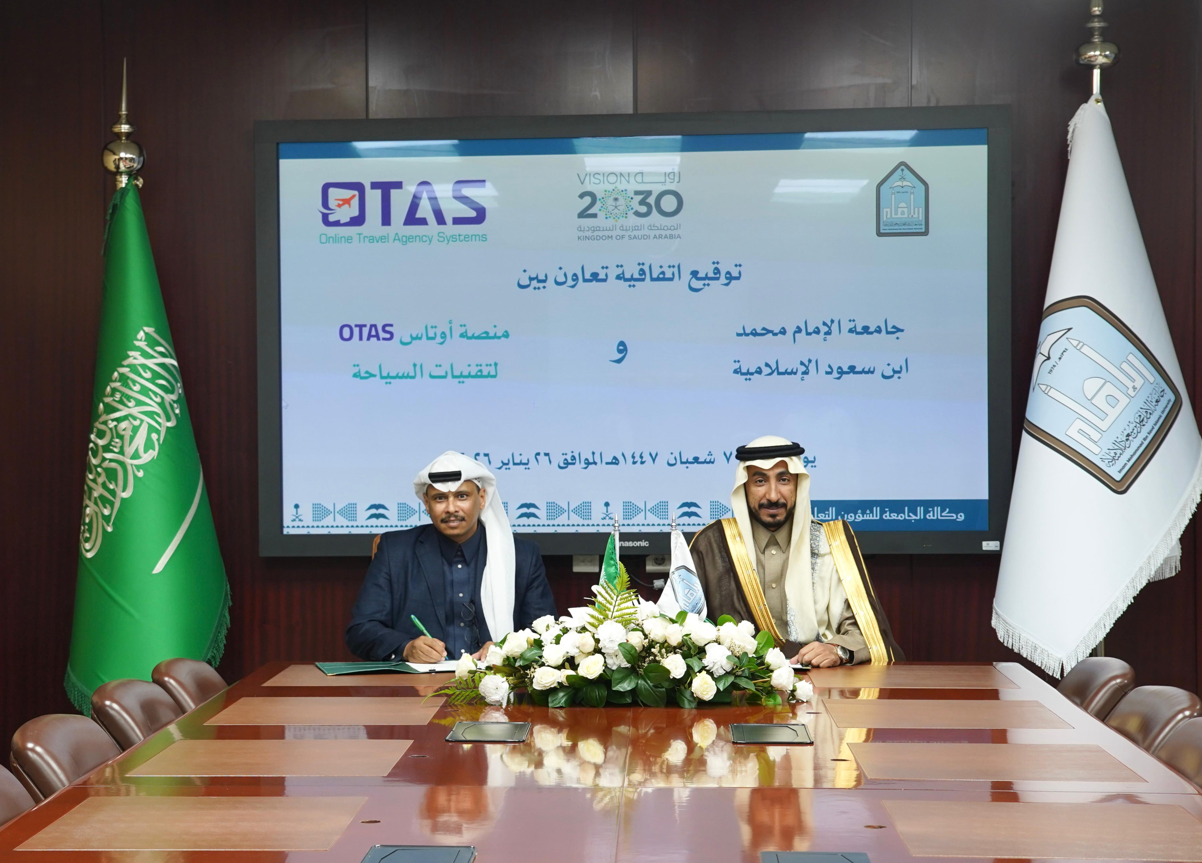 وقّعت جامعة الإمام محمد بن سعود الإسلامية يوم الاثنين الموافق 26 يناير 2026م، في مدينة الرياض، اتفاقية تعاون مع منصة أوتاس (OTAS) لتقنيات السياحة، وذلك في إطار سعي الجامعة إلى تعزيز شراكاتها مع المنصات الوطنية المتخصصة، ودعم مجالات التدريب التعاوني، والتقنيات السياحية، وتبادل الخبرات، بما يسهم في تطوير العملية التعليمية وتحقيق مستهدفات رؤية السعودية 2030.