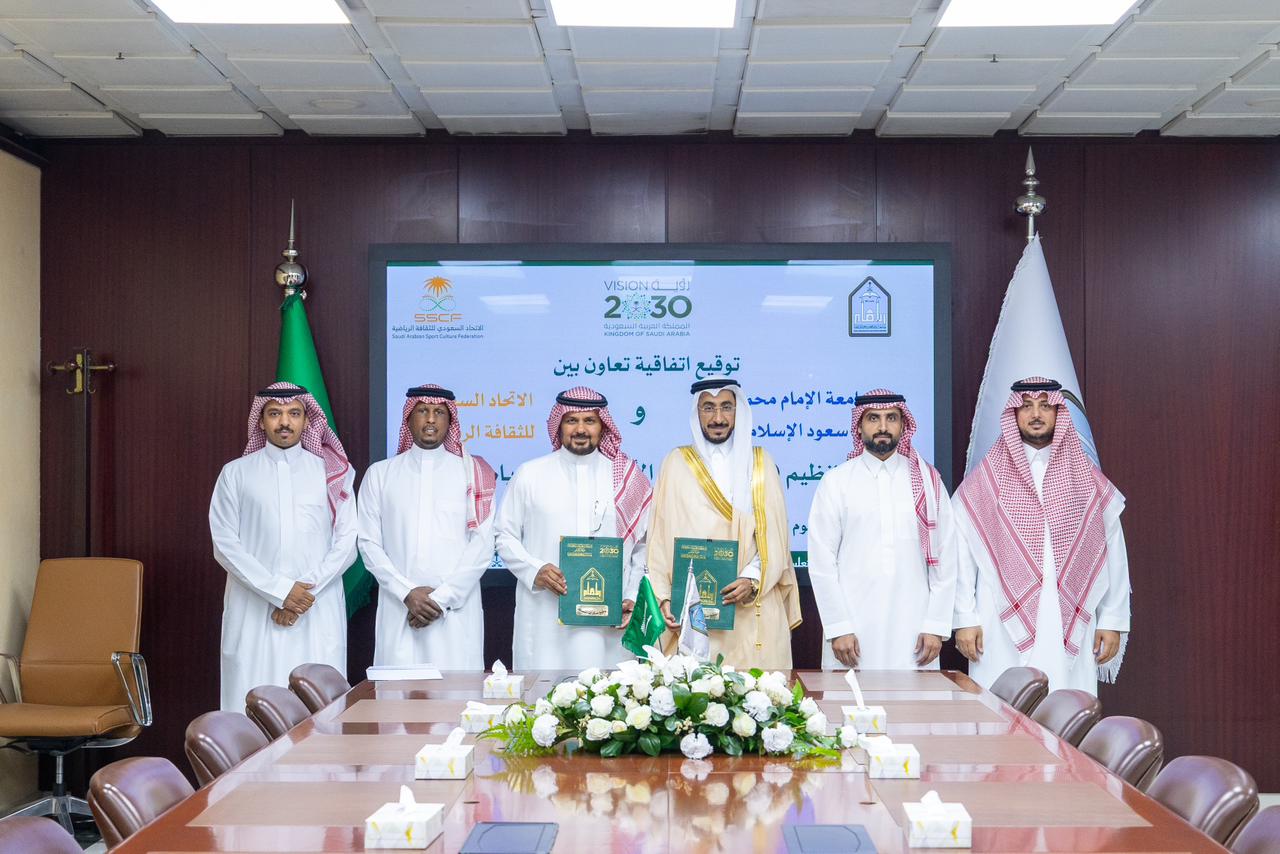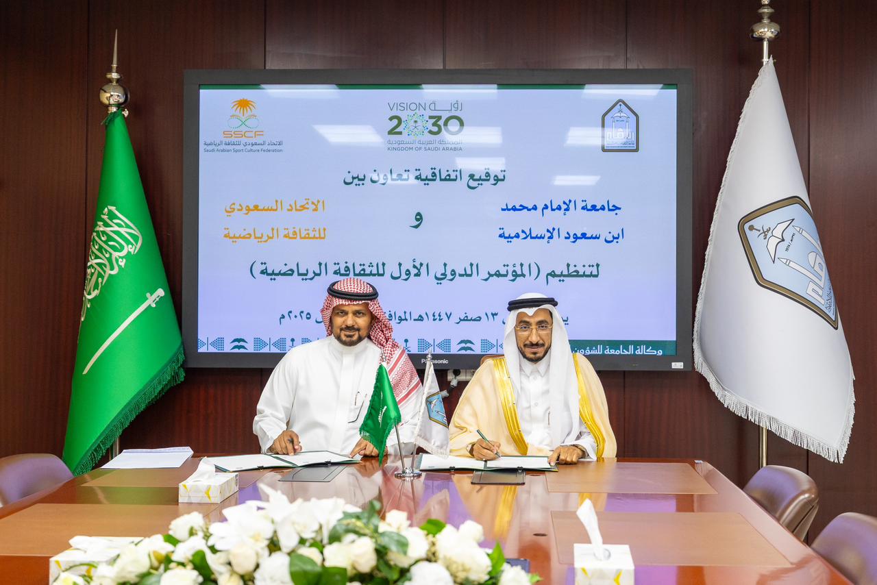 وقّعت جامعة الإمام محمد بن سعود الإسلامية اليوم الخميس 13 صفر 1447هـ، اتفاقية تعاون مع الاتحاد السعودي للثقافة الرياضية والتي تهدف إلى تنظيم وإدارة المؤتمر والمعرض الدولي الأول للثقافة الرياضية، والمزمع إقامته في الجامعة خلال الفترة من 27 إلى 29 يناير 2026م.